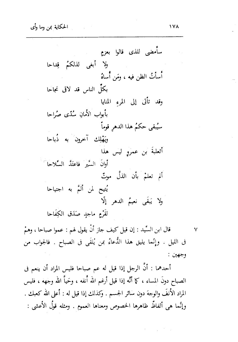 قَالَ ابْن السَّيِّد: إِن قيل كَيفَ جَازَ أَن يَقُول لَهُم: عموا صباحا وهم فِي اللَّيْل. وَإِنَّمَا يَلِيق هَذَا الدُّعَاء بِمن يلقى فِي الصَّباح. فَالْجَوَاب من وَجْهَيْن: أَحدهمَا: أَن الرجل إِذا قيل لَهُ: عَم صباحاً فَلَيْسَ المُرَاد أَن ينعم فِي الصَّباح دون الْمسَاء كَمَا أَنه إِذا قيل أرْغم الله أَنفه وَحيا الله وَجهه فَلَيْسَ المُرَاد الْأنف وَالْوَجْه دون سَائِر الْجِسْم. وَكَذَلِكَ إِذا قيل لَهُ: أَعلَى الله كعبك. وَإِنَّمَا هِيَ ألفاظٌ ظَاهرهَا الْخُصُوص وَمَعْنَاهَا الْعُمُوم. وَمثله قَول الْأَعْشَى: