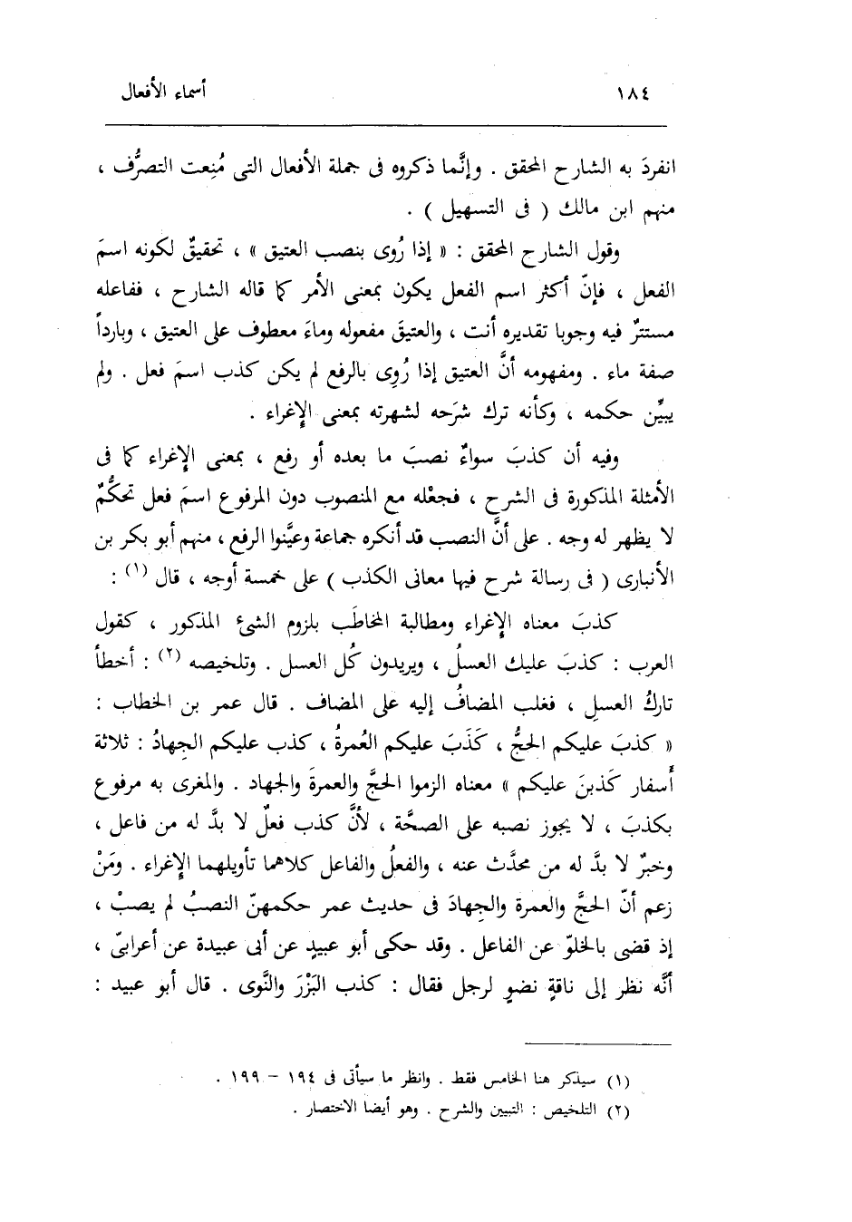 تَقْدِيره أَنْت والعتيق مَفْعُوله وَمَاء مَعْطُوف على الْعَتِيق وبارداً صفة مَاء. وَمَفْهُومه أَن الْعَتِيق إِذا رُوِيَ بِالرَّفْع لم يكن كذب اسْم فعل. وَلم يبين حكمه وَكَأَنَّهُ ترك شَرحه لشهرته بِمَعْنى الإغراء. وَفِيه أَن كذب سواءٌ نصب مَا بعده أَو رفع بِمَعْنى الإغراء كَمَا فِي الْأَمْثِلَة الْمَذْكُورَة فِي الشَّرْح فَجعله مَعَ الْمَنْصُوب دون الْمَرْفُوع اسْم فعل تحكمٌ لَا يظْهر لَهُ وَجه. على أَن النصب قد أنكرهُ جمَاعَة وعينوا الرّفْع مِنْهُم أَبُو بكر بن الْأَنْبَارِي فِي رِسَالَة شرح فِيهَا مَعَاني الْكَذِب على خَمْسَة أوجه قَالَ: كذب مَعْنَاهُ الإغراء ومطالبة الْمُخَاطب بِلُزُوم الشَّيْء الْمَذْكُور كَقَوْل الْعَرَب: كذب عَلَيْك الْعَسَل ويريدون كل الْعَسَل. وتلخيصه: أَخطَأ تَارِك الْعَسَل فغلب الْمُضَاف إِلَيْهِ على الْمُضَاف. قَالَ عمر بن الْخطاب: كذب عَلَيْكُم الْحَج كذب عَلَيْكُم الْعمرَة كذب عَلَيْكُم الْجِهَاد: ثَلَاثَة أسفار كذبن عَلَيْكُم مَعْنَاهُ الزموا الْحَج وَالْعمْرَة وَالْجهَاد. والمغرى بِهِ مَرْفُوع بكذب لَا يجوز نَصبه على الصِّحَّة لِأَن كذب فعل لَا بُد لَهُ من فَاعل وخبرٌ لَا بُد من مُحدث عَنهُ وَالْفِعْل وَالْفَاعِل كِلَاهُمَا تأويلهما الإغراء. وَمن زعم أَن الْحَج وَالْعمْرَة وَالْجهَاد فِي حَدِيث عمر حكمهن النصب لم يصب إِذْ قضى بالخلو عَن الْفَاعِل. وَقد حكى أَبُو عبيدٍ عَن)
