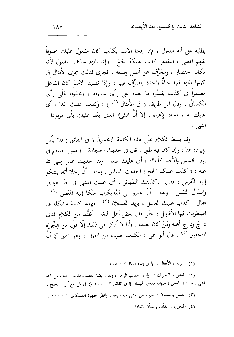 فَقَالَ: كذب عَلَيْك الْعَسَل يُرِيد العسلان. فَهَذِهِ كلمة مشكلة قد اضْطَرَبَتْ فِيهَا الْأَقَاوِيل حَتَّى قَالَ بعض أهل اللُّغَة: أظنها من الْكَلَام الَّذِي درج ودرج أَهله وَمن كَانَ يُعلمهُ. وَأَنا لَا أذكر من ذَلِك إِلَّا قَول من هجيراه التَّحْقِيق. قَالَ أَبُو عَليّ: الْكَذِب ضربٌ من القَوْل وَهُوَ نطق كَمَا أَن