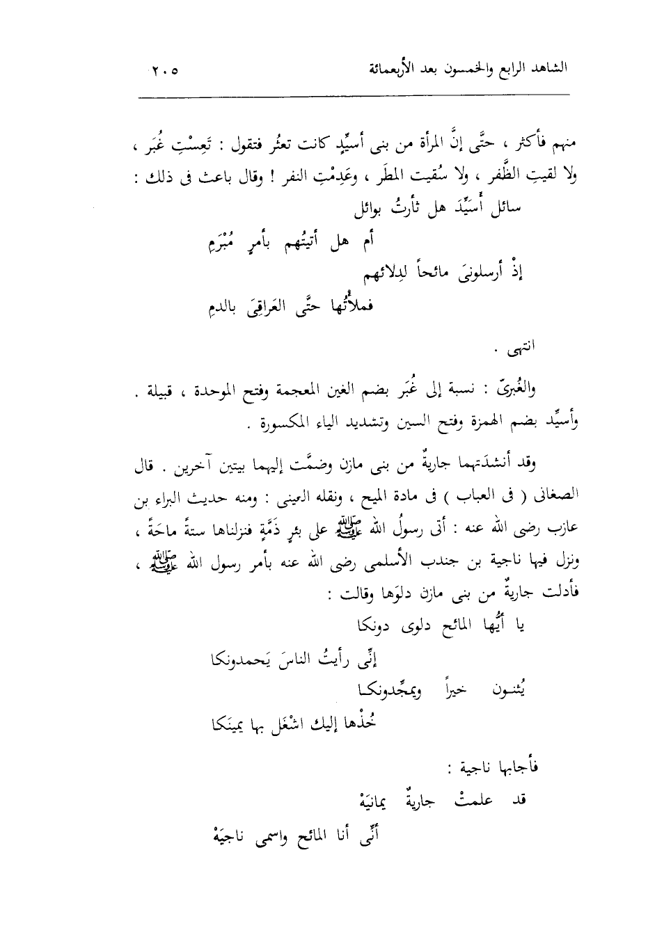 انْتهى. والغبري: نِسْبَة إِلَى غبر بِضَم الْغَيْن الْمُعْجَمَة وَفتح الْمُوَحدَة قَبيلَة. وَأسيد بِضَم الْهمزَة وَفتح السِّين وَتَشْديد الْيَاء الْمَكْسُورَة. وَقد أنشدتهما جاريةٌ من بني مَازِن وضمت إِلَيْهِمَا بَيْتَيْنِ آخَرين. وَقَالَ الصغاني فِي الْعباب فِي مَادَّة الميح وَنَقله الْعَيْنِيّ: وَمِنْه حَدِيث الْبَراء بن عَازِب رَضِيَ اللَّهُ عَنْه: أَتَى رَسُول الله صَلَّى اللَّهُ عَلَيْهِ وَسَلَّم َ على بئرٍ ذمةٍ فنزلناها سِتَّة ماحةً وَنزل فِيهَا نَاجِية بن جُنْدُب الْأَسْلَمِيّ رَضِيَ اللَّهُ عَنْه بِأَمْر رَسُول الله صَلَّى اللَّهُ عَلَيْهِ وَسَلَّم َ فأدلت جاريةٌ من بني مَازِن دلوها وَقَالَت:)