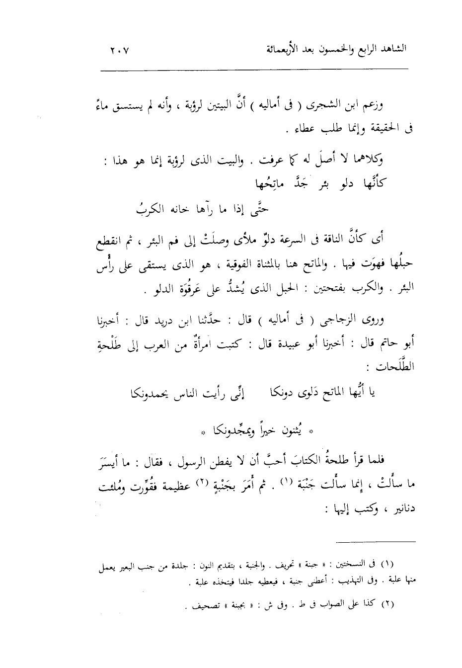 وَزعم ابْن الشجري فِي أَمَالِيهِ أَن الْبَيْتَيْنِ لرؤبة وَأَنه لم يستسق مَاء فِي الْحَقِيقَة وَإِنَّمَا طلب عَطاء. وَكِلَاهُمَا لَا أصل لَهُ كَمَا عرفت. وَالْبَيْت الَّذِي لرؤبة إِنَّمَا هُوَ هَذَا: أَي: كَأَن النَّاقة فِي السرعة دلوٌ ملأى وصلت إِلَى فَم الْبِئْر ثمَّ انْقَطع حبلها فهوت فِيهَا. والماتح هُنَا بِالْمُثَنَّاةِ الْفَوْقِيَّة هُوَ الَّذِي يَسْتَقِي على رَأس الْبِئْر. وَالْكرب بِفتْحَتَيْنِ: الْحَبل الَّذِي يشد على عرقوة الدَّلْو. وروى الزجاجي فِي أَمَالِيهِ قَالَ: حَدثنَا ابْن دُرَيْد قَالَ: أخبرنَا أَبُو حَاتِم قَالَ: أخبرنَا أَبُو عُبَيْدَة قَالَ: كتبت امرأةٌ من الْعَرَب إِلَى طَلْحَة الطلحات:)