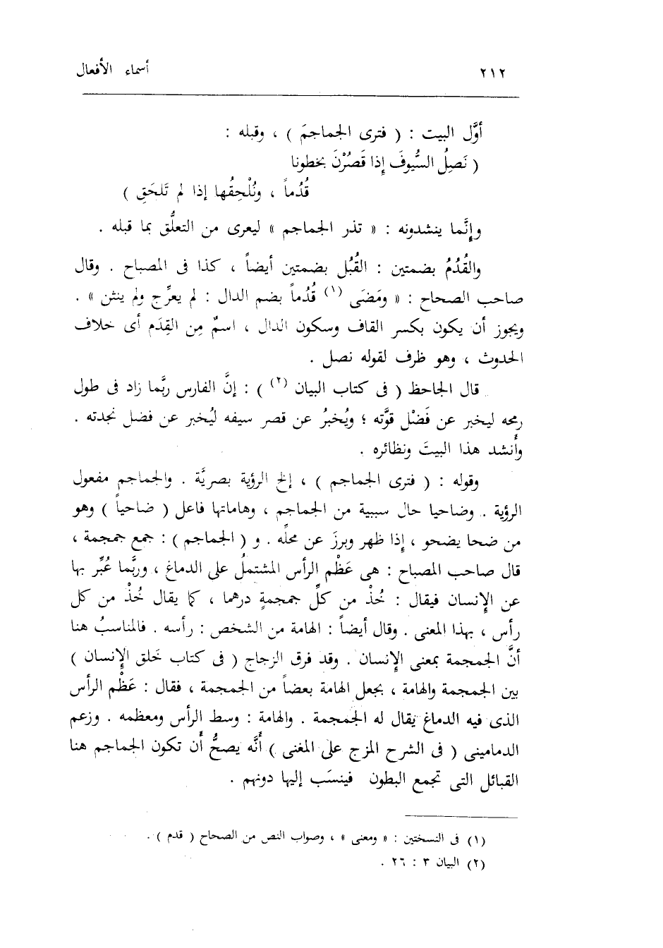 وَإِنَّمَا ينشدونه: تذر الجماجم ليعرى من التَّعَلُّق بِمَا قبله. والقدم بِضَمَّتَيْنِ: والقبل بِضَمَّتَيْنِ أَيْضا كَذَا فِي الْمِصْبَاح. وَقَالَ صَاحب الصِّحَاح: وَمضى قدماً بِضَم الدَّال: لم يعرج وَلم ينثن. وَيجوز أَن يكون بِكَسْر الْقَاف وَسُكُون الدَّال اسمٌ من الْقدَم أَي: جلاف الْحُدُوث وَهُوَ ظرف لقَوْله: نصل. قَالَ الجاحظ فِي كتاب الْبَيَان: إِن الْفَارِس رُبمَا زَاد فِي طول رمحه ليخبر عَن فضل قوته ويخبر عَن قصر سَيْفه ليخبر عَن فضل نجدته. وَأنْشد هَذَا الْبَيْت ونظائره. وَقَوله: فترى الجماجم إِلَخ الرُّؤْيَة بصرية: والجماجم: مفعول الرُّؤْيَة. وضاحياً: حَال سَبَبِيَّة من الجماجم وهاماتها: فَاعل ضاحياً وَهُوَ من ضحا يضحو: إِذا ظهر وبرز عَن مَحَله.