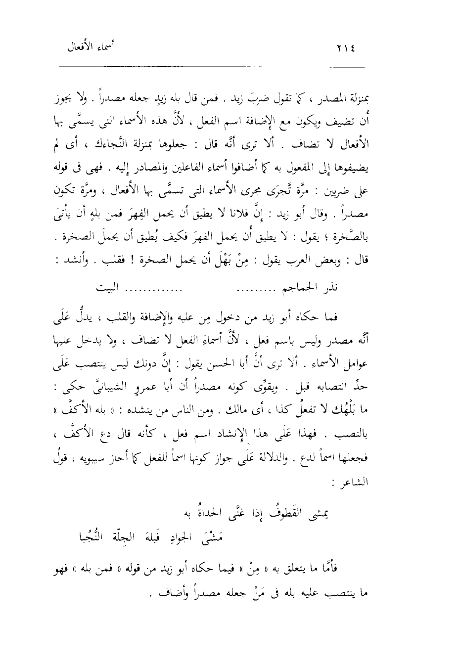 صَاحب الصِّحَاح: مشي النجيبة بله الجلة النجبا وَنسبه إِلَى ابْن هرمة. وَقَالَ أَبُو حَيَّان فِي تَذكرته: هَذَا الَّذِي تَأَوَّلَه سِيبَوَيْهٍ فِي الْخَفْض من نِيَابَة بله عَن الْمصدر الْمُضَاف إِلَى المخفوض عِنْد الْكُوفِيّين على مَعْنيين: إِن كَانَ المخفوض بِتَأْوِيل مَرْفُوع وَتَقْدِير ضرب: ليضْرب زيدٌ فَالْكَلَام صَحِيح. وَإِن كَانَ تَقْدِير المخفوض النصب والتأويل اضْرِب زيدا فَالْكَلَام عِنْدهم خطأ لِأَن الْمصدر الَّذِي يتَعَدَّى فعله إِلَى الْمَفْعُول إِذا أفرد بواحدٍ أضيف إِلَيْهِ وَلم يذكر مَعَه غَيره فَلَا بُد من أَن يكون ذَلِك الْوَاحِد مَرْفُوعا لِأَن الْفِعْل لَا يَخْلُو من الْفَاعِل وَمَا