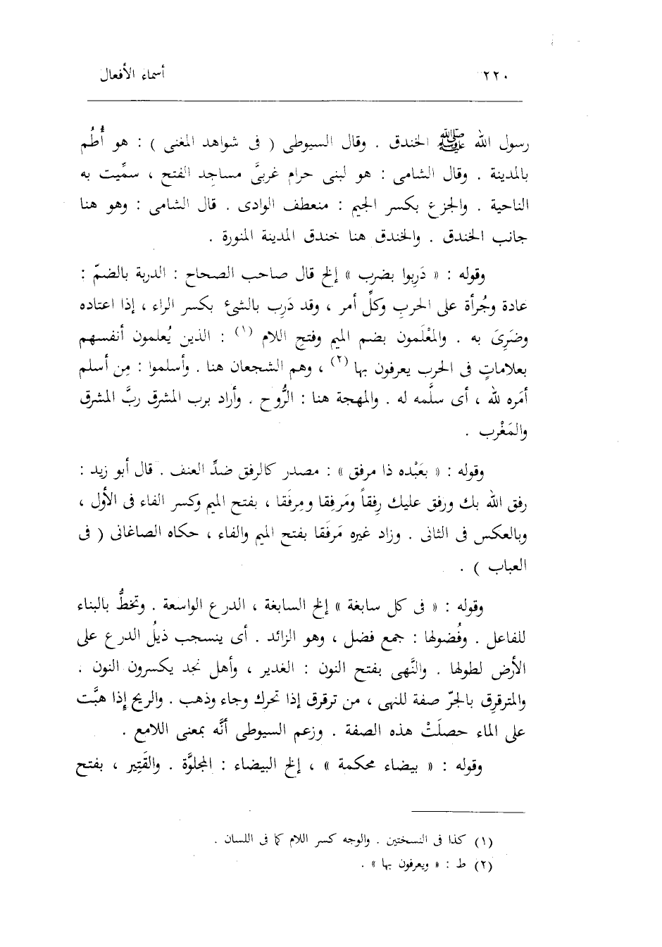 وَقَالَ الشَّامي: هُوَ لبني حرَام غربي مَسَاجِد الْفَتْح سميت بِهِ النَّاحِيَة. والجزع بِكَسْر الْجِيم: منعطف الْوَادي. قَالَ الشَّامي: وَهُوَ هُنَا جَانب الخَنْدَق. وَالْخَنْدَق هُنَا هُوَ خَنْدَق الْمَدِينَة. وَقَوله: دربوا بِضَرْب إِلَخ قَالَ صَاحب الصِّحَاح: الدربة بِالضَّمِّ: عَادَة وجرأة على الْحَرْب وكل أَمر وَقد درب بالشَّيْء بِكَسْر الرَّاء إِذا اعتاده وضري بِهِ. والمعلمون بِضَم الْمِيم وَفتح اللَّام: الَّذين يعلمُونَ أنفسهم بعلامات فِي الْحَرْب يعْرفُونَ بهَا وهم الشجعان هُنَا. وَأَسْلمُوا: من أسلم أمره لله أَي: سلمه لَهُ. والمهجة هُنَا: الرّوح. وَأَرَادَ بِرَبّ الْمشرق رب الْمشرق وَالْمغْرب. وَقَوله: بِعَبْدِهِ ذَا مرفقٍ: مصدر كالرفق ضد العنف. قَالَ أَبُو زيد: رفق الله بك ورفق عَلَيْك رفقا ومرفقاً بِفَتْح الْمِيم وَكسر الْفَاء فِي الأول وَبِالْعَكْسِ فِي الثَّانِي. وَزَاد غَيره مرفقاً بِفَتْح الْمِيم وَالْفَاء حَكَاهُ الصَّاغَانِي فِي الْعباب. وَقَوله: فِي كل سابغة إِلَخ السابغة: الدرْع الواسعة وتخط بِالْبِنَاءِ للْفَاعِل.