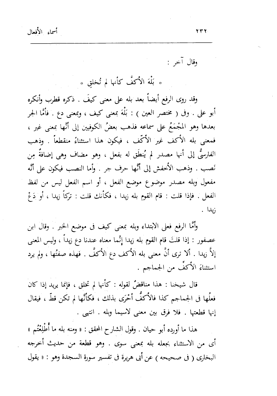 بله الأكف كَأَنَّهَا لم تخلق وَقد رُوِيَ الرّفْع أَيْضا بعد بله على معنى كَيفَ. ذكره قطرب وَأنْكرهُ أَبُو عَليّ. وَفِي مُخْتَصر الْعين: بله بِمَعْنى كَيفَ وَبِمَعْنى دع. فَأَما الْجَرّ بعْدهَا وَهُوَ الْمجمع على سَمَاعه فَذهب بعض الْكُوفِيّين إِلَى أَنَّهَا بِمَعْنى غير فَمَعْنَى بله الأكف غير الأكف فَيكون هَذَا اسْتثِْنَاء مُنْقَطِعًا.