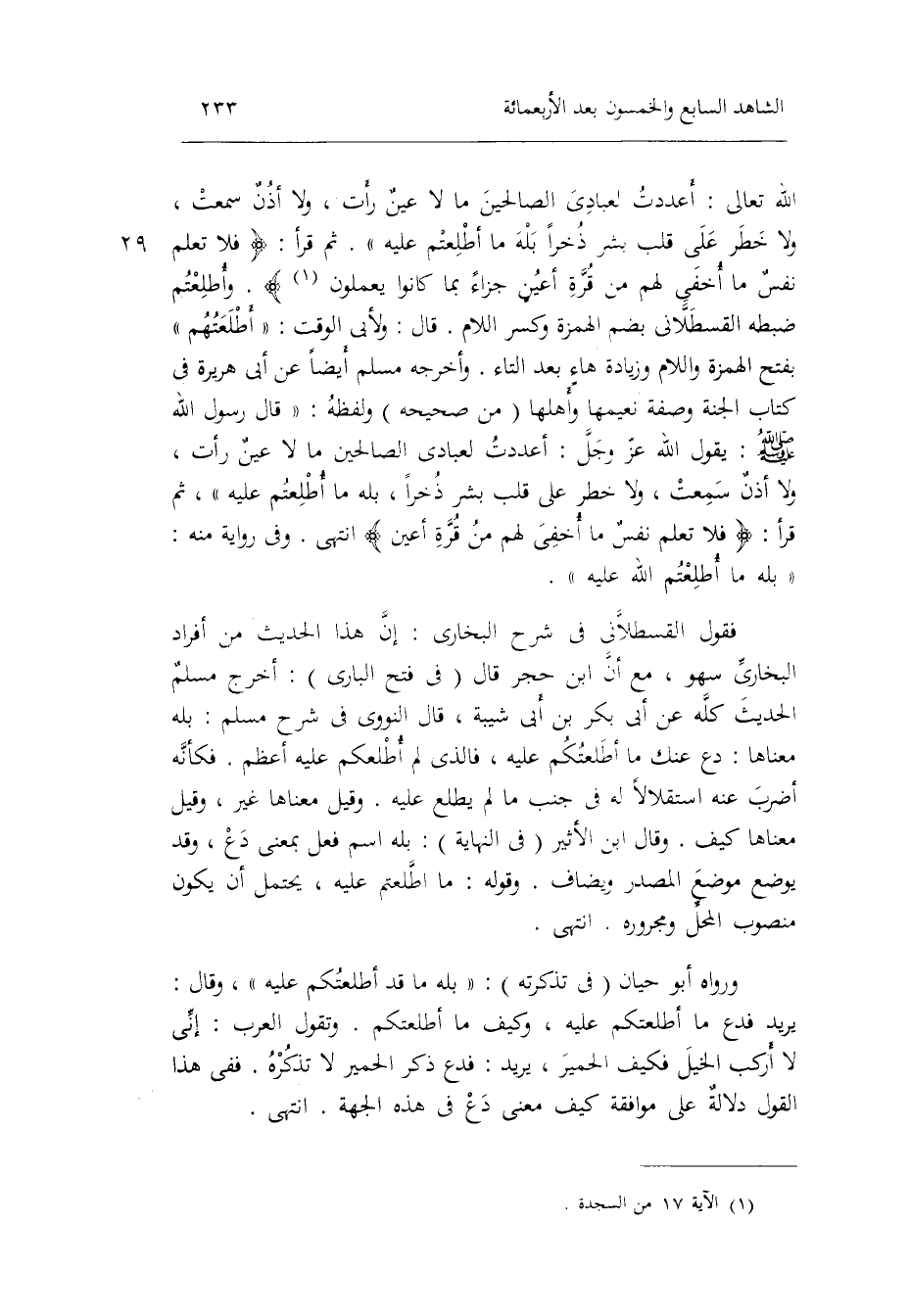 أَعدَدْت لعبادي الصَّالِحين مَا لَا عينٌ رَأَتْ وَلَا أذنٌ سَمِعت وَلَا خطر على قلب بشر ذخْرا بله مَا أطلعْتُم عَلَيْهِ. ثمَّ قَرَأَ: فَلَا تعلم نفسٌ مَا أُخْفِي لَهُم من قُرَّة أعينٍ جَزَاء بِمَا كَانُوا يعْملُونَ. وأطلعتم ضَبطه الْقُسْطَلَانِيّ بِضَم الْهمزَة وَكسر اللَّام.