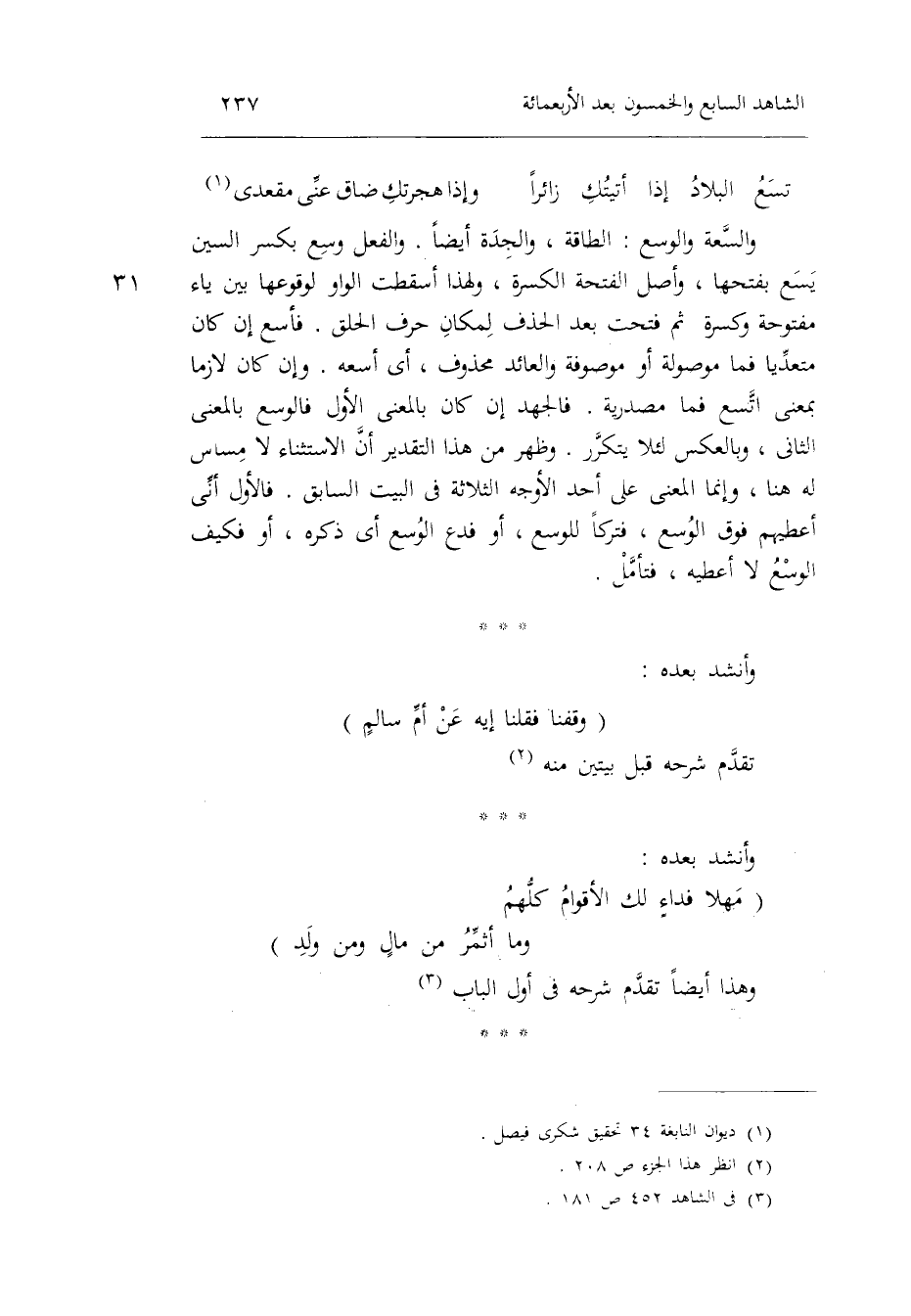 الوسع فتركاً للوسع أَو فدع الوسع أَي: ذكره أَو فَكيف الوسع لَا أعْطِيه فَتَأمل. وَأنْشد بعده: وقفنا فَقُلْنَا إيه عَن أم سالمٍ تقدم شَرحه قبل بَيْتَيْنِ مِنْهُ. وَأنْشد بعده: