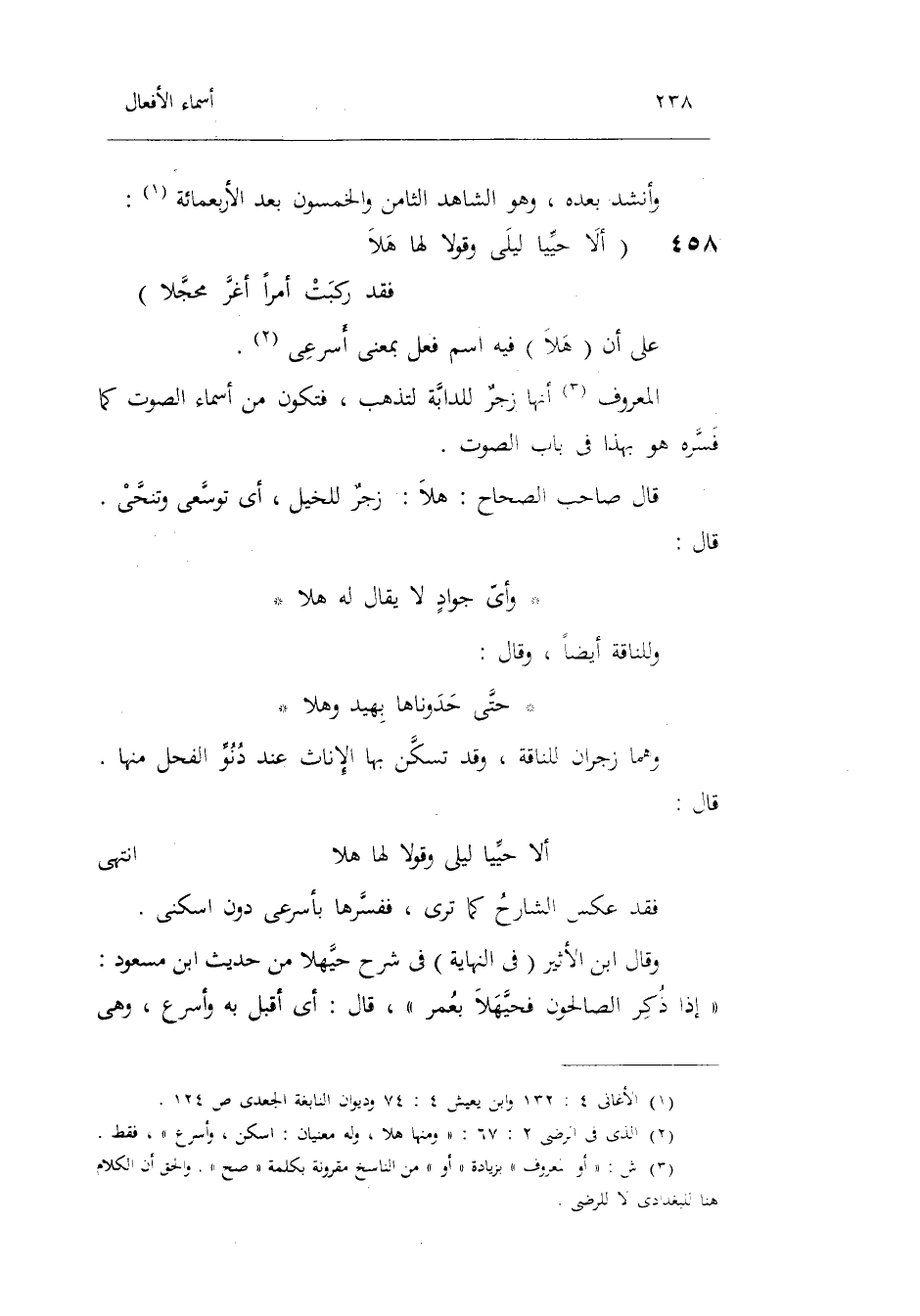 الْمَعْرُوف أَنَّهَا زجرٌ للدابة لتذهب فَتكون من أَسمَاء الصَّوْت كَمَا فسره هُوَ بِهَذَا فِي بَاب الصَّوْت. قَالَ صَاحب الصِّحَاح: هلا: زجرٌ للخيل أَي: توسعي وتنحي. قَالَ: وَأي جوادٍ لَا يُقَال لَهُ هلا وللناقة أَيْضا وَقَالَ: حَتَّى حدوناها بهيدٍ وهلا وهما زجران للناقة وَقد تسكن بهَا الْإِنَاث عِنْد دنو الْفَحْل مِنْهَا. قَالَ: أَلا حييا ليلى وقولا لَهَا هلا انْتهى. فقد عكس الشَّارِح كَمَا ترى فَفَسَّرَهَا بأسرعي دون اسكني. وَقَالَ ابْن الْأَثِير فِي النِّهَايَة فِي شرح حيهلا من حَدِيث ابْن مَسْعُود: إِذا ذكر الصالحون فَحَيَّهَلا بعمر قَالَ: أَي: أقبل بِهِ وأسرع وَهِي