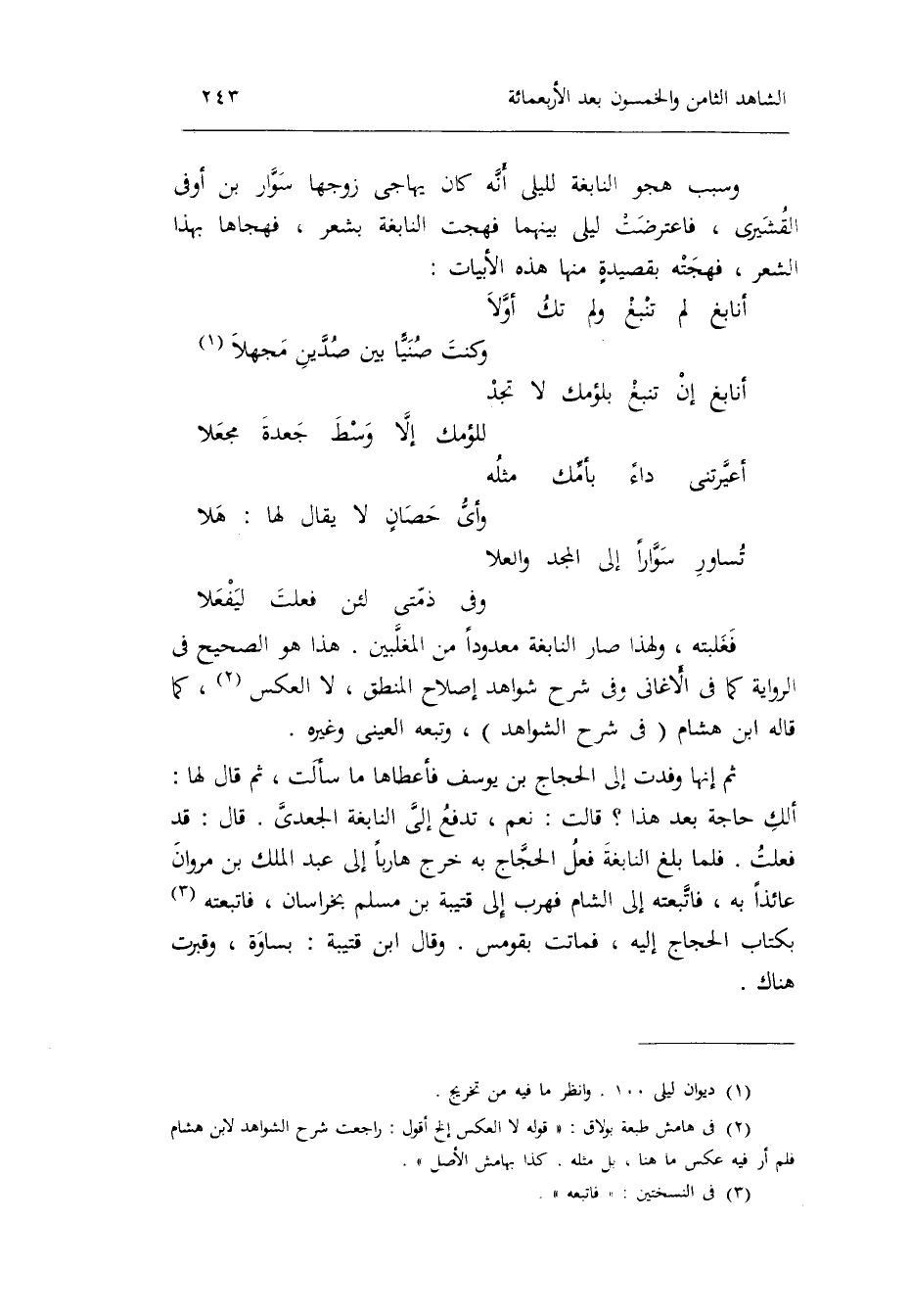 فغلبته وَلِهَذَا صَار النَّابِغَة معدوداً من المغلبين. هَذِه هُوَ الصَّحِيح فِي الرِّوَايَة كَمَا فِي الأغاني وَفِي شرح شَوَاهِد إصْلَاح الْمنطق لَا الْعَكْس كَمَا قَالَه ابْن هِشَام فِي شرح الشواهد وَتَبعهُ الْعَيْنِيّ وَغَيره. ثمَّ إِنَّهَا وفدت إِلَى الْحجَّاج بن يُوسُف فَأَعْطَاهَا مَا سَأَلت ثمَّ قَالَ لَهَا: أَلَك حَاجَة بعد هَذَا قَالَت: نعم تدفع إِلَيّ النَّابِغَة الْجَعْدِي. قَالَ: قد فعلت. فَلَمَّا بلغ النَّابِغَة فعل الْحجَّاج بِهِ خرج هَارِبا إِلَى عبد الْملك بن مَرْوَان عائذاً بِهِ فاتبعته إِلَى الشَّام فهرب إِلَى قُتَيْبَة بن مُسلم بخراسان فاتبعته بِكِتَاب الْحجَّاج إِلَيْهِ فَمَاتَتْ