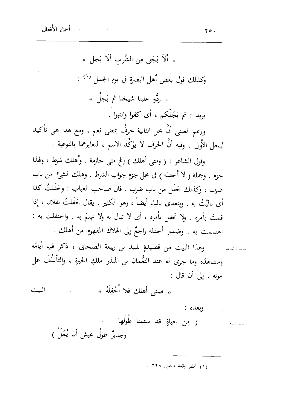 أَلا بجلي من الشَّرَاب أَلا بجل وَكَذَلِكَ قَول بعض أهل الْبَصْرَة فِي يَوْم الْجمل: ردوا علينا شَيخنَا ثمَّ بجل يُرِيد: ثمَّ بجلكم أَي: كفوا وانتهوا. وَزعم الْعَيْنِيّ أَن بجل الثَّانِيَة حرفُ بِمَعْنى نعم وَمَعَ هَذَا فَهِيَ تَأْكِيد لبجل الأولى. وَفِيه أَن الْحَرْف لَا يُؤَكد الِاسْم لتغايرهما بالنوعية. وَقَول الشَّاعِر: وَمَتى أهلك إِلَخ مَتى: جازمة. وَأهْلك شَرط وَلِهَذَا جزم. وَجُمْلَة: لَا أحفله فِي مَحل جزم جَوَاب)