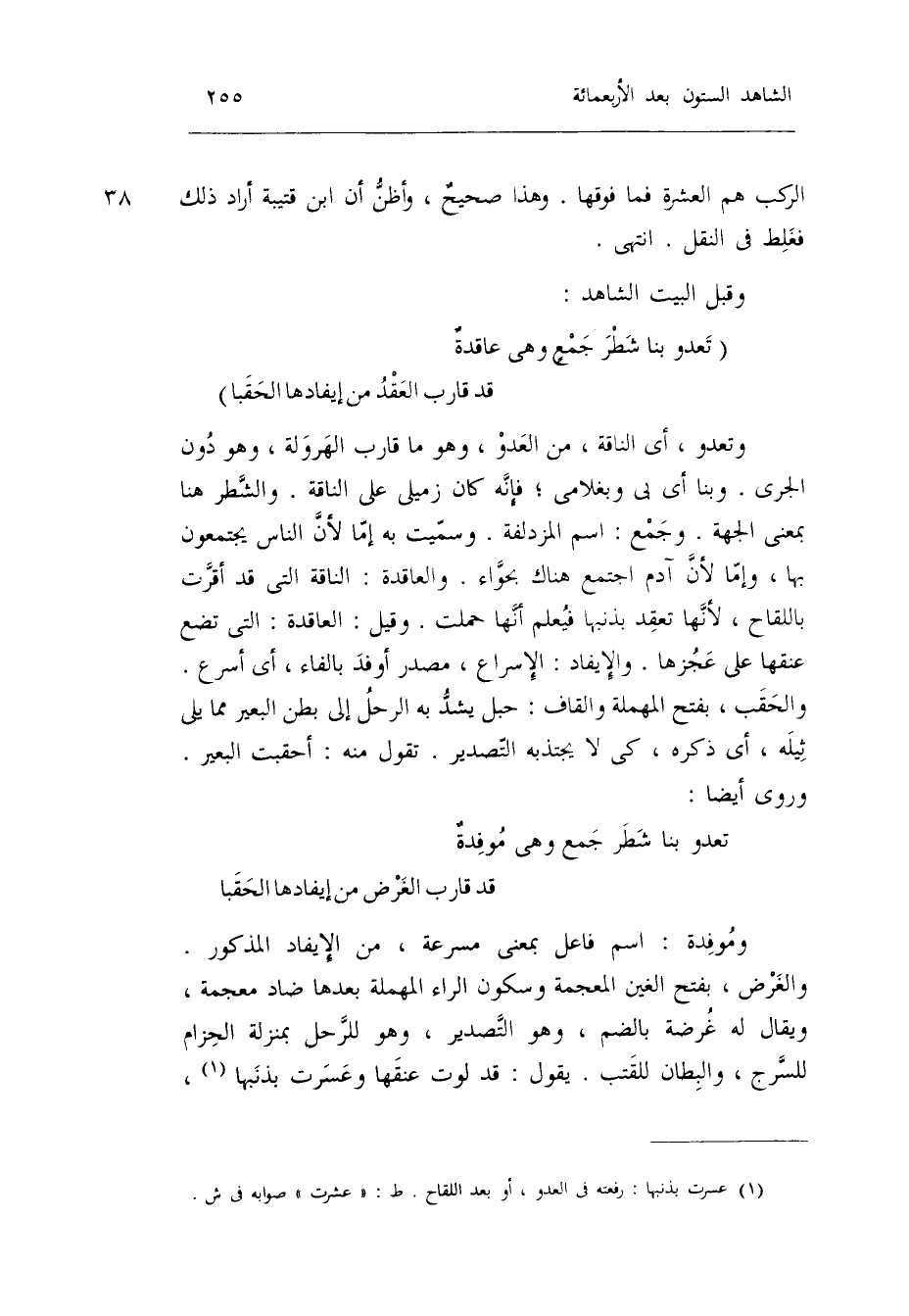 (تعدو بِنَا شطر جمعٍ وَهِي عاقدةٌ ... قد قَارب العقد من إيفادها الحقبا)