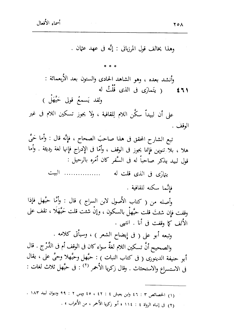 على أَن لبيداً سكن اللَّام للقافية فَلَا يجوز تسكين اللَّام فِي غير الْوَقْف. تبع الشَّارِح الْمُحَقق فِي هَذَا صَاحب الصِّحَاح فَإِنَّهُ قَالَ: وَأما حَيّ هلا بِلَا تَنْوِين فإمَّا تجوز فِي الْوَقْف وَأما فِي الإدراج فَإِنَّهَا لُغَة رَدِيئَة. وَأما قَول لبيد يذكر صاحباً لَهُ فِي السّفر كَانَ أمره بالرحيل: يتمارى فِي الَّذِي قلت لَهُ ... ... ... ... . . الْبَيْت فَإِنَّمَا سكنه للقافية. وَأَصله من كتاب الْأُصُول لِابْنِ السراج قَالَ: وَأما حيهل فَإِذا وقفت فَإِن شِئْت قلت: حيهل بِالسُّكُونِ وَإِن شِئْت قلت: حيهلا تقف على الْألف كَمَا وقفت فِي أَنا.