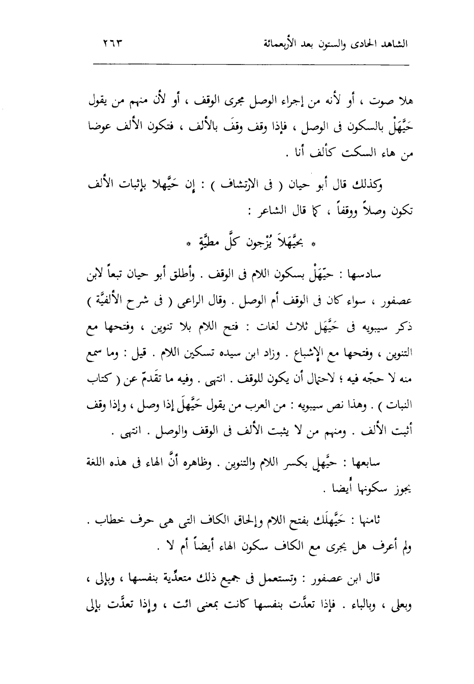 هلا صَوت أَو لِأَنَّهُ من إِجْرَاء الْوَصْل مجْرى الْوَقْف أَو لِأَن مِنْهُم من يَقُول حيهل بِالسُّكُونِ فِي الْوَصْل فَإِذا وقف وقف بِالْألف فَتكون الْألف عوضا من هَاء السكت كألف أَنا. وَكَذَلِكَ قَالَ أَبُو حَيَّان فِي الارتشاف: إِن حيهلا بِإِثْبَات الْألف تكون وصلا ووقفاً كَمَا قَالَ الشَّاعِر: بحيهلا يزجون كل مطيةٍ سادسها: حيهل بِسُكُون اللَّام فِي الْوَقْف. وَأطلق أَبُو حَيَّان تبعا لِابْنِ عُصْفُور سَوَاء كَانَ فِي الْوَقْف أم الْوَصْل. وَقَالَ الرَّاعِي فِي شرح الألفية ذكر سِيبَوَيْهٍ فِي حيهل ثَلَاث لُغَات: فتح اللَّام بِلَا تَنْوِين وَفتحهَا مَعَ التَّنْوِين وَفتحهَا مَعَ الإشباع. وَزَاد ابْن سَيّده تسكين اللَّام. قيل: وَمَا سمع مِنْهُ لَا حجَّة فِيهِ لاحْتِمَال أَن يكون للْوَقْف. انْتهى. وَفِيه مَا تقدم عَن كتاب النَّبَات. وَهَذَا نَص سِيبَوَيْهٍ: من الْعَرَب من يَقُول حيهل إِذا وصل وَإِذا وقف أثبت الْألف. وَمِنْهُم من لَا يثبت الْألف فِي الْوَقْف والوصل. انْتهى. سابعها: حيهلٍ بِكَسْر اللَّام والتنوين. وَظَاهره أَن الْهَاء فِي هَذِه اللُّغَة يجوز سكونها أَيْضا.