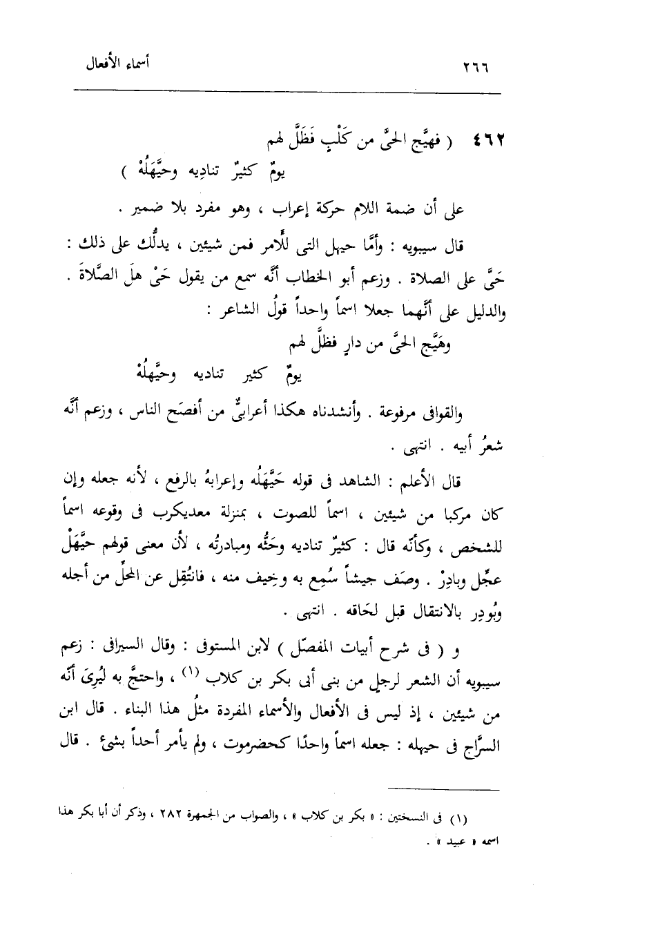 والقوافي مَرْفُوعَة. وأنشدناه هَكَذَا أعرابيٌّ من أفْصح النَّاس وَزعم أَنه شعر أَبِيه. انْتهى. قَالَ الأعلم: الشَّاهِد فِي قَوْله: حيهله وَإِعْرَابه بِالرَّفْع لِأَنَّهُ جعله وَإِن كَانَ مركبا من شَيْئَيْنِ اسْما للصوت بِمَنْزِلَة معديكرب فِي وُقُوعه اسْما للشَّخْص وَكَأَنَّهُ قَالَ: كثيرٌ تناديه وحثه ومبادرته لِأَن معنى قَوْلهم: حيهل: عجل وبادر وصف جَيْشًا سمع بِهِ وَخيف مِنْهُ فانتقل عَن الْمحل من أَجله وبودر بالانتقال قبل لحاقه. انْتهى. وَفِي شرح أَبْيَات الْمفصل لِابْنِ المستوفي: وَقَالَ السيرافي: زعم سِيبَوَيْهٍ أَن الشّعْر لرجلٍ من بني أبي بكر بن كلاب وَاحْتج بِهِ ليري أَنه من شَيْئَيْنِ إِذْ لَيْسَ فِي الْأَفْعَال والأسماء المفردة مثل هَذَا الْبناء. قَالَ ابْن السراج فِي حيهله: جعله اسْما وَاحِدًا كحضرموت وَلم يَأْمر أحدا بِشَيْء.