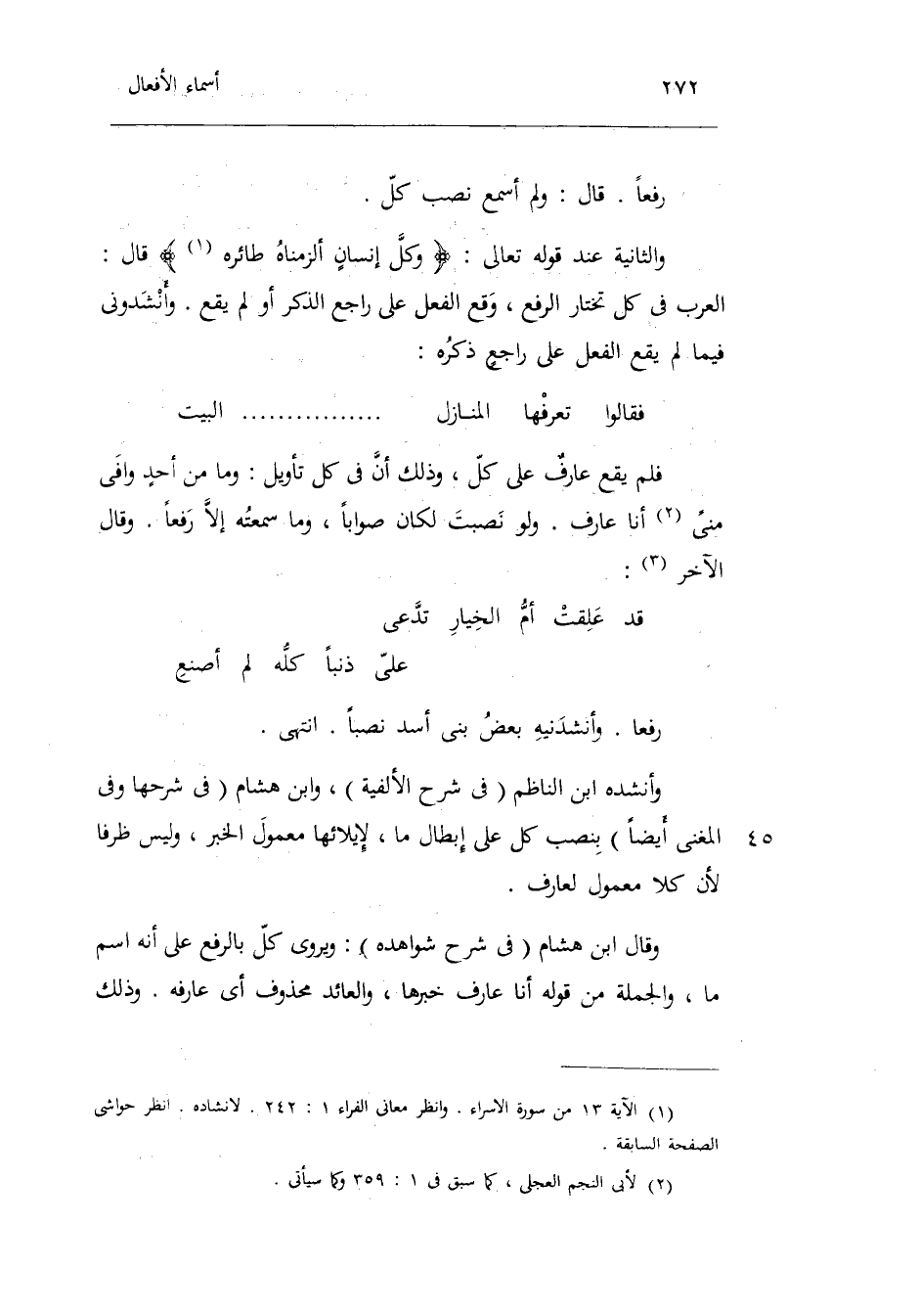 رفعا. قَالَ: وَلم أسمع نصب كل. وَالثَّانيَِة عِنْد قَوْله تَعَالَى: وكل إِنْسَان ألزمناه طَائِره قَالَ: الْعَرَب فِي كل تخْتَار الرّفْع وَقع الْفِعْل على رَاجع الذّكر أَو لم يَقع. وأنشدوني فِيمَا لم يَقع الْفِعْل على راجعٍ ذكره: فَقَالُوا تعرفها الْمنَازل ... ... ... ... . . الْبَيْت فَلم يَقع عارفٌ على كل وَذَلِكَ أَن فِي كل تَأْوِيل: وَمَا من أحدٍ وافى منى أَنا عَارِف. وَلَو نصبت لَكَانَ صَوَابا وَمَا سمعته إِلَّا رفعا. وَقَالَ الآخر: