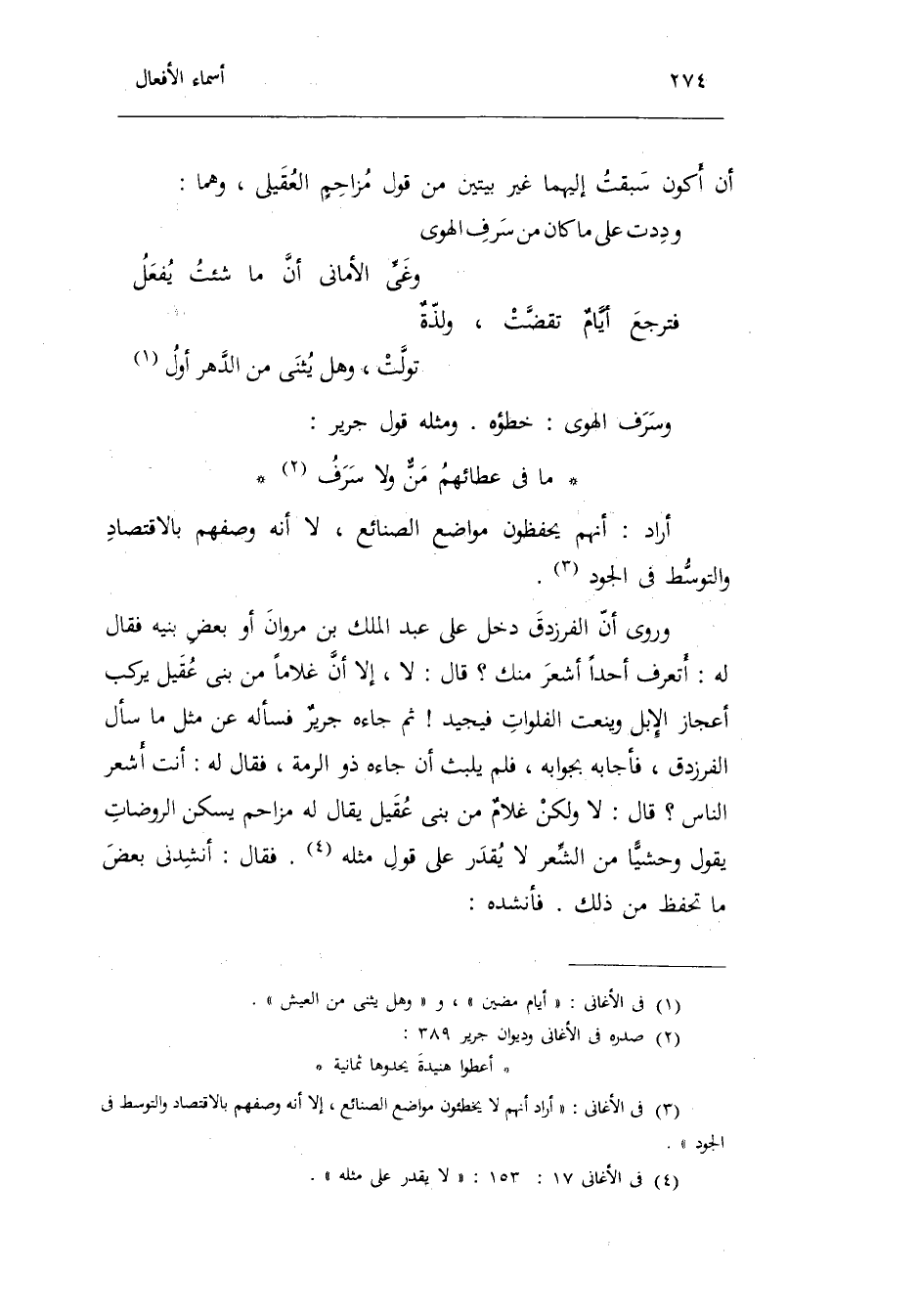 وسرف الْهوى: خَطؤُهُ. وَمثله قَول جرير: مَا فِي عطائهم منٌّ وَلَا سرف أَرَادَ أَنهم يحفظون مَوَاضِع الصَّنَائِع لَا أَنه وَصفهم بالاقتصاد والتوسط فِي الْجُود. وَرُوِيَ أَن الفرزدق دخل على عبد الْملك بن مَرْوَان أَو بعض بنيه فَقَالَ لَهُ: يَا فرزدق أتعرف أحدا أشعر مِنْك قَالَ: لَا إِلَّا أَن غُلَاما من بني عقيل يركب أعجاز الْإِبِل وينعت الفلوات فيجيد ثمَّ جَاءَهُ جرير فَسَأَلَهُ عَن مثل مَا سَأَلَ عَنهُ الفرزدق فَأَجَابَهُ بجوابه فَلم يلبث أَن جَاءَهُ ذُو الرمة فَقَالَ لَهُ: لَا وَلَكِن غلامٌ من بني عقيل يُقَال لَهُ مُزَاحم يسكن الروضات يَقُول وحشياً من الشّعْر لَا يقدر على قَول مثله. فَقَالَ: أَنْشدني بعض مَا تحفظ من ذَلِك. فأنشده: ...