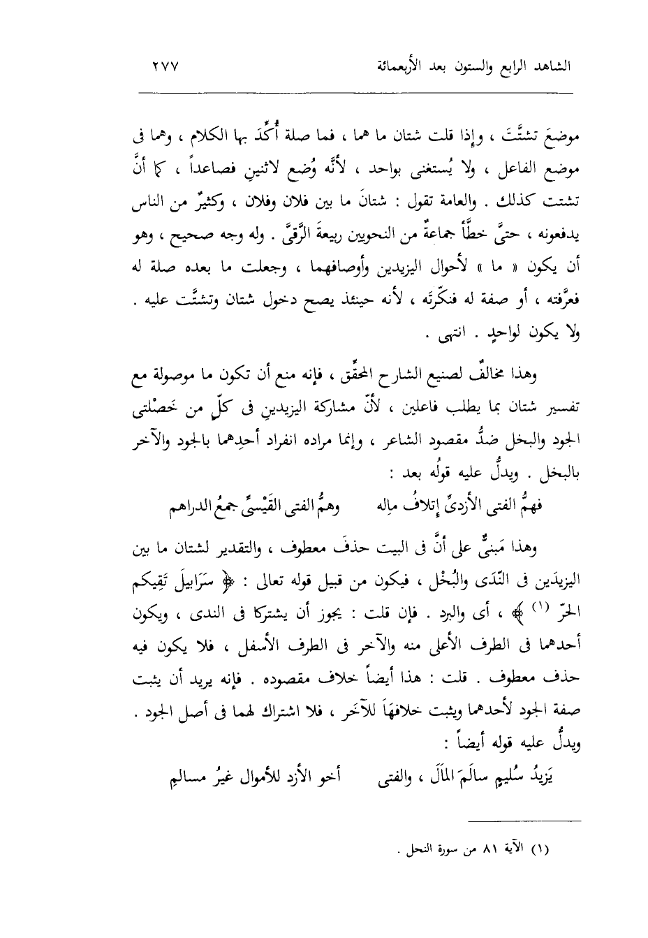 فَإِن مُشَاركَة اليزيدين فِي كلٍّ من خصلتي الْجُود وَالْبخل ضد مَقْصُود الشَّاعِر وَإِنَّمَا مُرَاده انْفِرَاد أَحدهمَا بالجود وَالْآخر بالبخل. وَيدل عَلَيْهِ قَوْله بعد: وَهَذَا مبنيٌّ على أَن فِي الْبَيْت حذف مَعْطُوف وَالتَّقْدِير: لشتان مَا بَين اليزيدين فِي الندى)