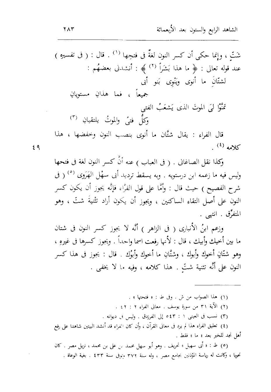 شتٍّ وَإِنَّمَا حكى أَن كسر النُّون لغةٌ فِي فتحهَا. قَالَ فِي تَفْسِيره عِنْد قَوْله تَعَالَى: مَا هَذَا بشرا: أَنْشدني بَعضهم: