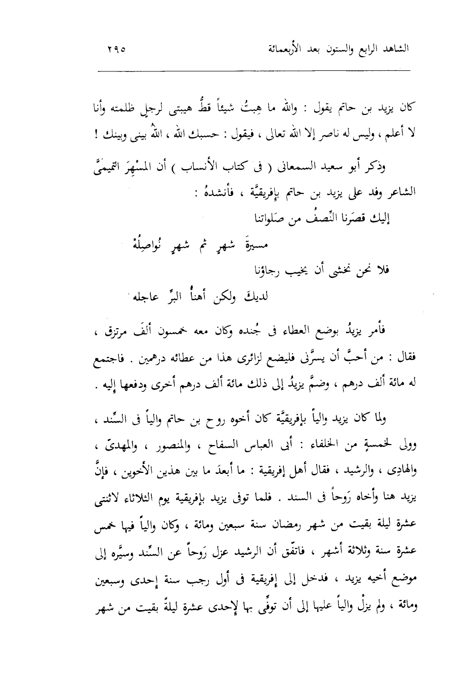فَأمر يزِيد بِوَضْع الْعَطاء فِي جنده وَكَانَ مَعَه خَمْسُونَ ألف مرتزق فَقَالَ: من أحب أَن يسرني فليضع لزائري هَذَا من عطائه دِرْهَمَيْنِ. فَاجْتمع لَهُ مائَة ألف دِرْهَم وَضم يزِيد إِلَى ذَلِك مائَة ألف دِرْهَم أُخْرَى وَدفعهَا إِلَيْهِ. وَلما كَانَ يزِيد والياً بإفريقية كَانَ أَخُوهُ روح بن حَاتِم والياً فِي السَّنَد وَولي لخمسةٍ من الْخُلَفَاء: أبي الْعَبَّاس السفاح والمنصور وَالْمهْدِي وَالْهَادِي والرشيد فَقَالَ أهل إفريقية: مَا أبعد مَا بَين هذَيْن الْأَخَوَيْنِ فَإِن يزِيد هُنَا وأخاه روحاً فِي السَّنَد. فَلَمَّا توفّي يزِيد بإفريقية يَوْم الثُّلَاثَاء لِاثْنَتَيْ عشرَة لَيْلَة بقيت من شهر رَمَضَان سنة سبعين وَمِائَة وَكَانَ والياً فِيهَا خمس عشرَة سنة وَثَلَاثَة أشهر فاتفق أَن الرشيد عزل روحاً السَّنَد وسيره إِلَى مَوضِع أَخِيه يزِيد فَدخل إِلَى إفريقية فِي أول رَجَب سنة إِحْدَى وَسبعين وَمِائَة وَلم يزل والياً عَلَيْهَا إِلَى أَن توفّي بهَا لإحدى عشرَة لَيْلَة بقيت من شهر