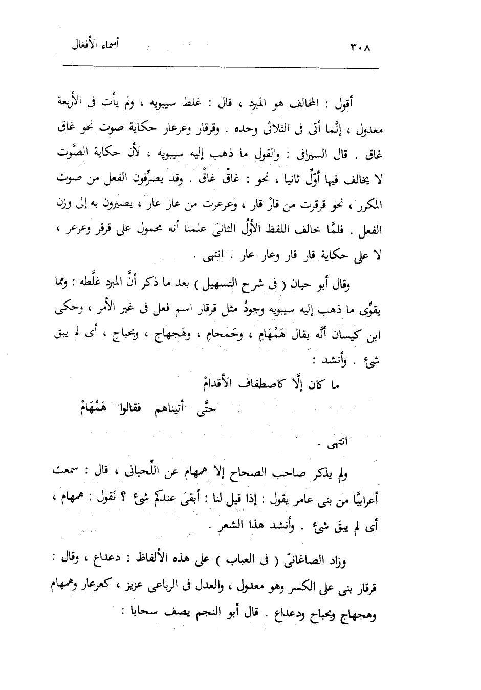 أَقُول: الْمُخَالف هُوَ الْمبرد قَالَ: غلط سِيبَوَيْهٍ وَلم يَأْتِ فِي الْأَرْبَعَة معدول إِنَّمَا أَتَى فِي الثلاثي وَحده. وقرقار وعرعار حِكَايَة صَوت نَحْو: غاق غاق. قَالَ السيرافي: وَالْقَوْل مَا ذهب إِلَيْهِ سِيبَوَيْهٍ لِأَن حِكَايَة الصَّوْت لَا يُخَالف فِيهَا أولٌ ثَانِيًا نَحْو: غاق غاق. وَقد يصرفون الْفِعْل من صَوت المكرر نَحْو: قرقرت من قار قار وعرعرت من عَار عَار يصيرون بِهِ إِلَى وزن الْفِعْل. فَلَمَّا خَالف اللَّفْظ الأول الثَّانِي علمنَا أَنه مَحْمُول على قرقر وعرعر لَا على حِكَايَة قار قار وعار عَار. انْتهى. وَقَالَ أَبُو حَيَّان فِي شرح التسهيل بعد مَا ذكر أَن الْمبرد غلطه: وَمِمَّا يُقَوي مَا ذهب إِلَيْهِ سِيبَوَيْهٍ وجود مثل قرقار اسْم فعل فِي غير الْأَمر وَحكى ابْن كيسَان أَنه يُقَال: همهام محمحام وهجهاج وبحباح أَي: لم يبْق شَيْء. وَأنْشد: انْتهى. وَلم يذكر صَاحب الصِّحَاح إِلَّا همهام عَن اللحياني قَالَ: سَمِعت أَعْرَابِيًا من بني عَامر يَقُول: إِذا قيل لنا: أُبْقِي عنْدكُمْ شَيْء نقُول: همهام أَي: لم يبْق شَيْء. وانشد هَذَا الشّعْر.
