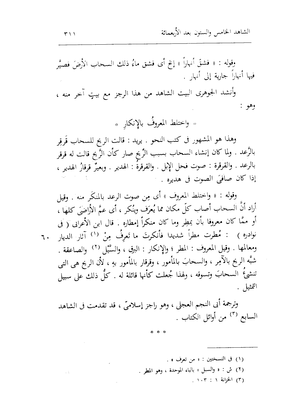 والقرقرة: الهدير. وبعيرٌ قرقار الهدير إِذا كَانَ صافي الصَّوْت فِي هديره. وَقَوله: وَاخْتَلَطَ الْمَعْرُوف أَي: من صَوت الرَّعْد بالمنكر مِنْهُ. وَقيل: أَرَادَ أَن السَّحَاب أصَاب كل مَكَان مِمَّا يعرف وينكر أَي: عَم الْأَرَاضِي كلهَا أَو مِمَّا كَانَ مَعْرُوفا بِأَن يمطر وَمَا كَانَ مُنْكرا إمطاره. قَالَ ابْن الْأَعرَابِي فِي نوادره: مطرَت مَطَرا شَدِيدا فأنكرت مَا تعرف من آثَار الديار ومعالمها. وَقيل الْمَعْرُوف: الْمَطَر وَالْإِنْكَار: الْبَرْق والسيل والصاعقة. شبه الرّيح بالآمر والسحاب بالمأمور وقرقار بالمأمور بِهِ لِأَن الرّيح هِيَ الَّتِي تنشأ السَّحَاب وتسوقه وَلِهَذَا جعلت الرّيح كَأَنَّهَا قائلة لَهُ. كل ذَلِك على سَبِيل التَّمْثِيل. وترجمة أبي النَّجْم الْعجلِيّ وَهُوَ راجز إسلامي قد تقدّمت