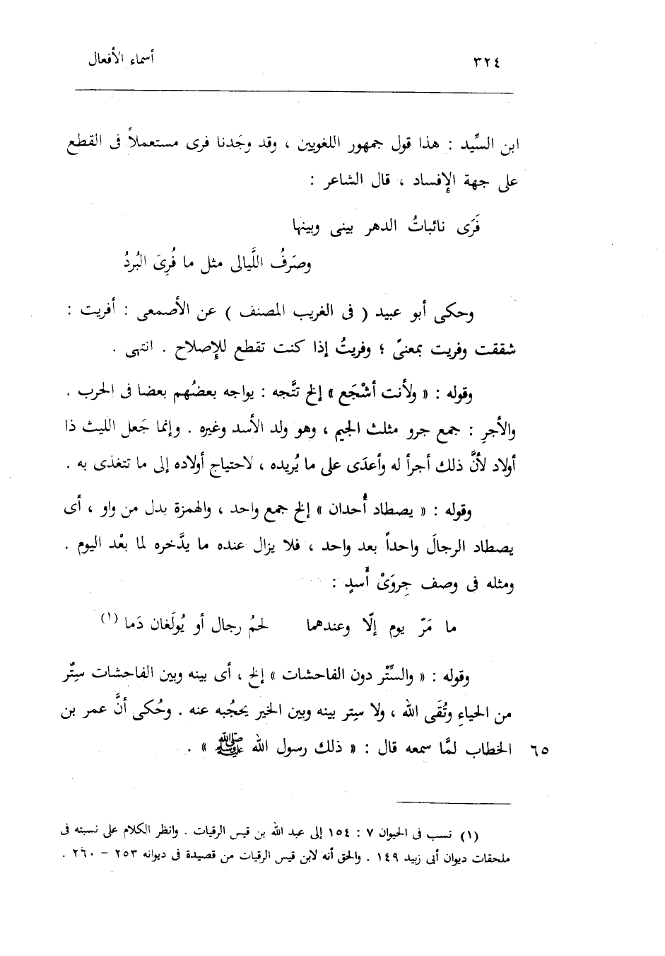 وَحكى أَبُو عبيد فِي الْغَرِيب المُصَنّف عَن الْأَصْمَعِي: أفريت: شققت وفريت بِمَعْنى وفريت إِذا كنت تقطع للإصلاح. انْتهى. وَقَوله: ولأنت أَشْجَع إِلَخ تتجه: يواجه بَعضهم بَعْضًا فِي الْحَرْب. وَالْأَجْر ي جمع جرو مثل الْجِيم وَهُوَ ولد الْأسد وَغَيره. وَإِنَّمَا جعل اللَّيْث ذَا أَوْلَاد لِأَن ذَلِك أجرا لَهُ وأعدى على مَا يُريدهُ لاحتياج أَوْلَاده إِلَى مَا تتغذى بِهِ. وَقَوله: يصطاد أحدان إِلَخ جمع وَاحِد والهمزة بدل من وَاو أَي: يصطاد الرِّجَال وَاحِدًا بعد الآخر فَلَا يزَال عِنْده مَا)