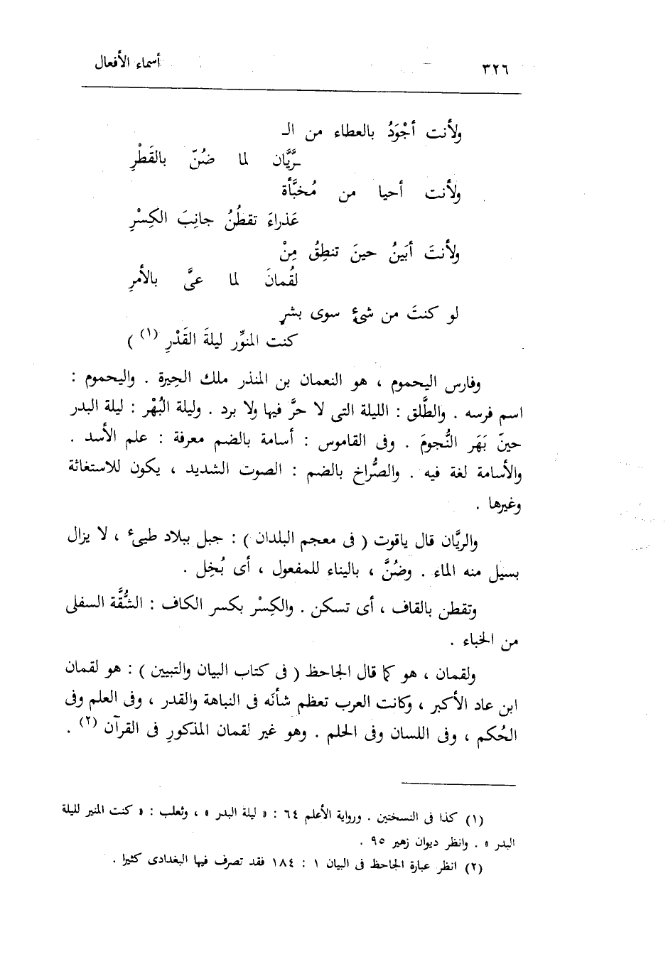 والريان قَالَ ياقوت فِي مُعْجم الْبلدَانِ: جبل بِبِلَاد طَيء لَا يزَال يسيل مِنْهُ المَاء وَضم بِالْبِنَاءِ للْمَفْعُول أَي: بخل. وتقطن بِالْقَافِ أَي: تسكن. وَالْكَسْر بِكَسْر الْكَاف: الشقة السُّفْلى من الخباء. ولقمان هُوَ كَمَا قَالَ الجاحظ فِي كتاب الْبَيَان والتبيين: هُوَ لُقْمَان ابْن عَاد الْأَكْبَر وَكَانَت الْعَرَب تعظم شَأْنه فِي النباهة وَالْقدر وَفِي الْعلم وَفِي الحكم وَفِي اللِّسَان وَفِي الْحلم. وَهُوَ غير)