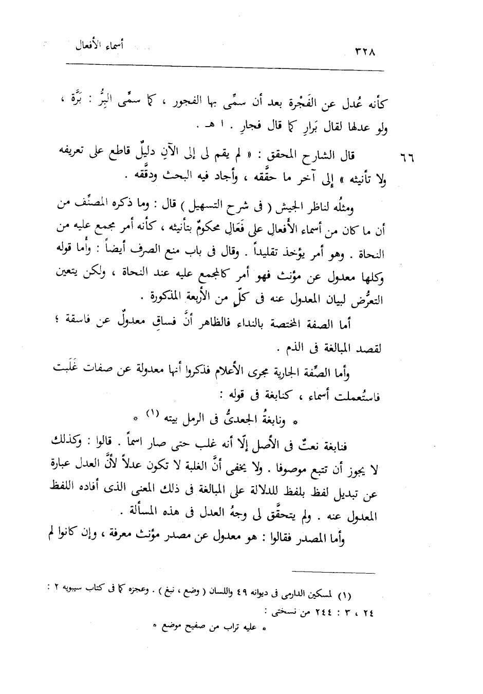 وَمثله لناظر الْجَيْش فِي شرح التسهيل قَالَ: وَمَا ذكره المُصَنّف من أَن مَا كَانَ من أَسمَاء الْأَفْعَال على فعال مَحْكُوم بتأنيثه كَأَنَّهُ أَمر مجمع عَلَيْهِ من النُّحَاة. وَهُوَ أَمر يُؤْخَذ تقليداً. وَقَالَ فِي بَاب منع الصّرْف أَيْضا: وَأما قَوْله وَكلهَا معدول عَن مؤنث فَهُوَ أَمر كالمجمع عَلَيْهِ عِنْد النُّحَاة وَلَكِن يتَعَيَّن التَّعَرُّض لبَيَان المعدول عَنهُ فِي كل من الْأَرْبَعَة الْمَذْكُورَة. أما الصّفة المختصة بالنداء فَالظَّاهِر أَن فساق معدولٌ عَن فاسقه لقصد الْمُبَالغَة فِي الذَّم. وَأما الصّفة الْجَارِيَة مجْرى الْأَعْلَام فَذكرُوا أَنَّهَا معدولة عَن صِفَات غلبت فاستعملت أَسمَاء كنابغة فِي قَوْله: ونابغة الْجَعْدِي فِي الرمل بَيته فنابغة: نعتٌ فِي الأَصْل إِلَّا أَنه غلب حَتَّى صَار اسْما. قَالُوا: وَكَذَلِكَ لَا يجوز أَن تتبع مَوْصُوفا. وَلَا يخفى أَن الْغَلَبَة لَا تكون عدلا لِأَن الْعدْل عبارَة عَن تَبْدِيل لفظ بِلَفْظ للدلالة على الْمُبَالغَة فِي ذَلِك الْمَعْنى الَّذِي أَفَادَهُ اللَّفْظ المعدول عَنهُ. وَلم يتَحَقَّق لي وَجه الْعدْل فِي هَذِه الْمَسْأَلَة. وَأما الْمصدر فَقَالُوا: هُوَ معدول عَن مصدر مؤنث معرفَة وَإِن كَانُوا لم