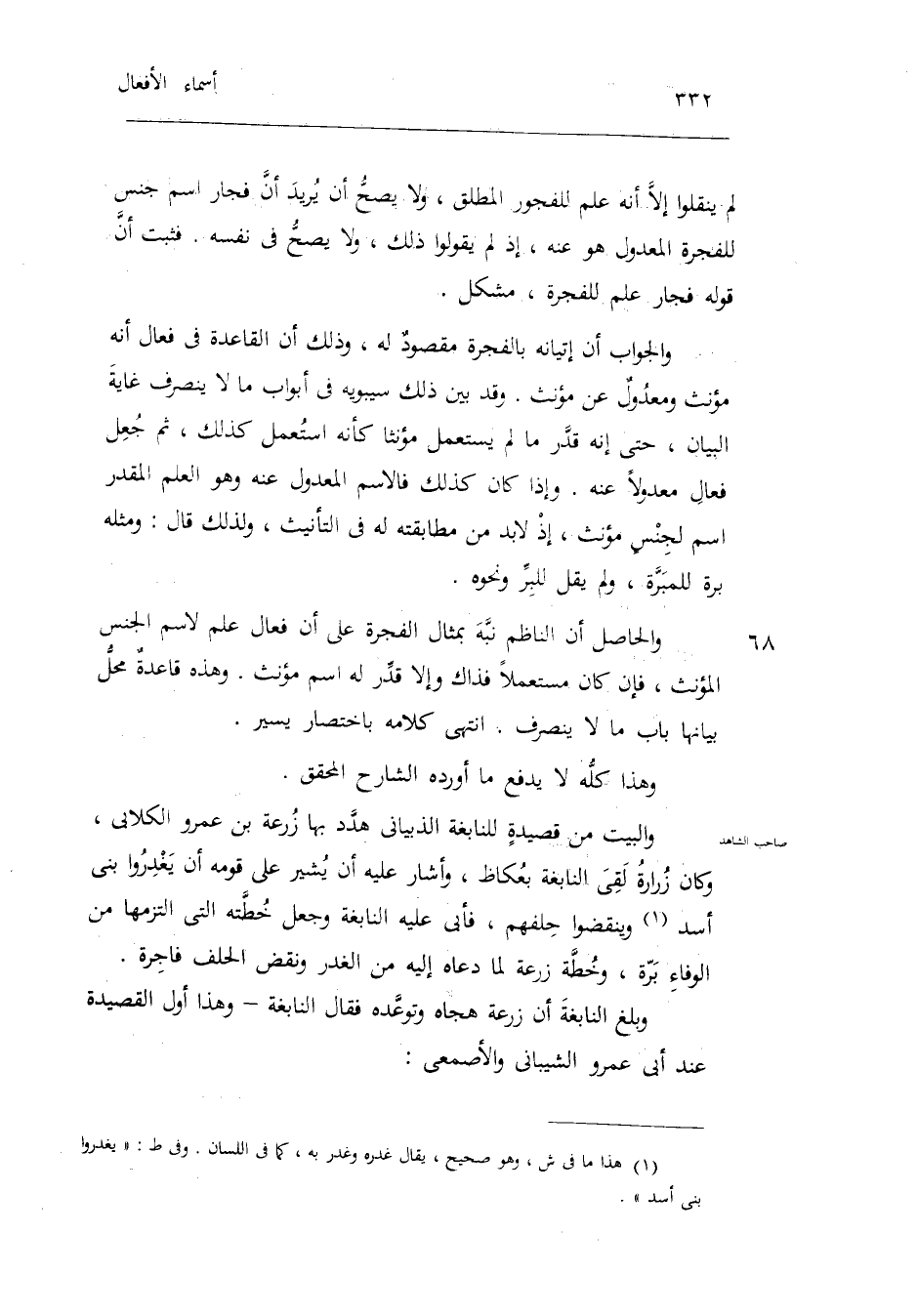 وَقد بَين ذَلِك سِيبَوَيْهٍ فِي أَبْوَاب مَا لَا ينْصَرف غَايَة الْبَيَان حَتَّى إِنَّه قدر مَا لم يسْتَعْمل مؤنثاً كَأَنَّهُ اسْتعْمل كَذَلِك ثمَّ جعل فعال معدولاً عَنهُ. وَإِذا كَانَ كَذَلِك فالاسم المعدول عَنهُ وَهُوَ الْعلم الْمُقدر اسْم لجنسٍ مؤنث إِذْ لَا بُد من مطابقته لَهُ فِي التَّأْنِيث وَلذَلِك قَالَ: وَمثله برة للمبرة وَلم يقل للبر وَنَحْوه. وَالْحَاصِل أَن النَّاظِم نبه بمثال الفجرة على أَن فعال علم لاسم الْجِنْس الْمُؤَنَّث فَإِن كَانَ مُسْتَعْملا فَذَاك وَإِلَّا قدر لَهُ اسْم مؤنث. وَهَذِه قاعدةٌ مَحل بَيَانهَا بَاب مَا لَا ينْصَرف.