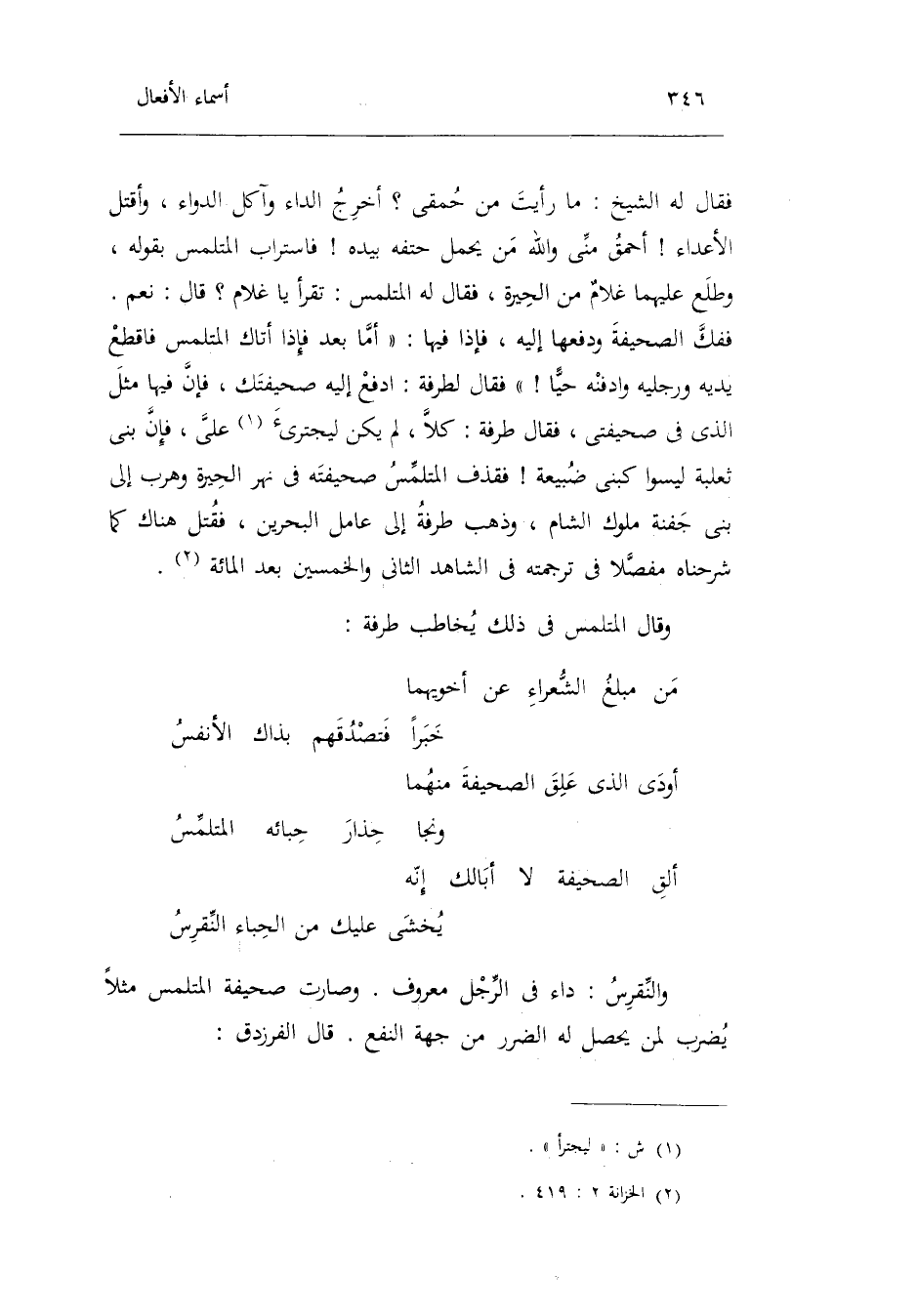 (ألق الصَّحِيفَة لَا أَبَا لَك إِنَّه ... يخْشَى عَلَيْك من الحباء النقرس)