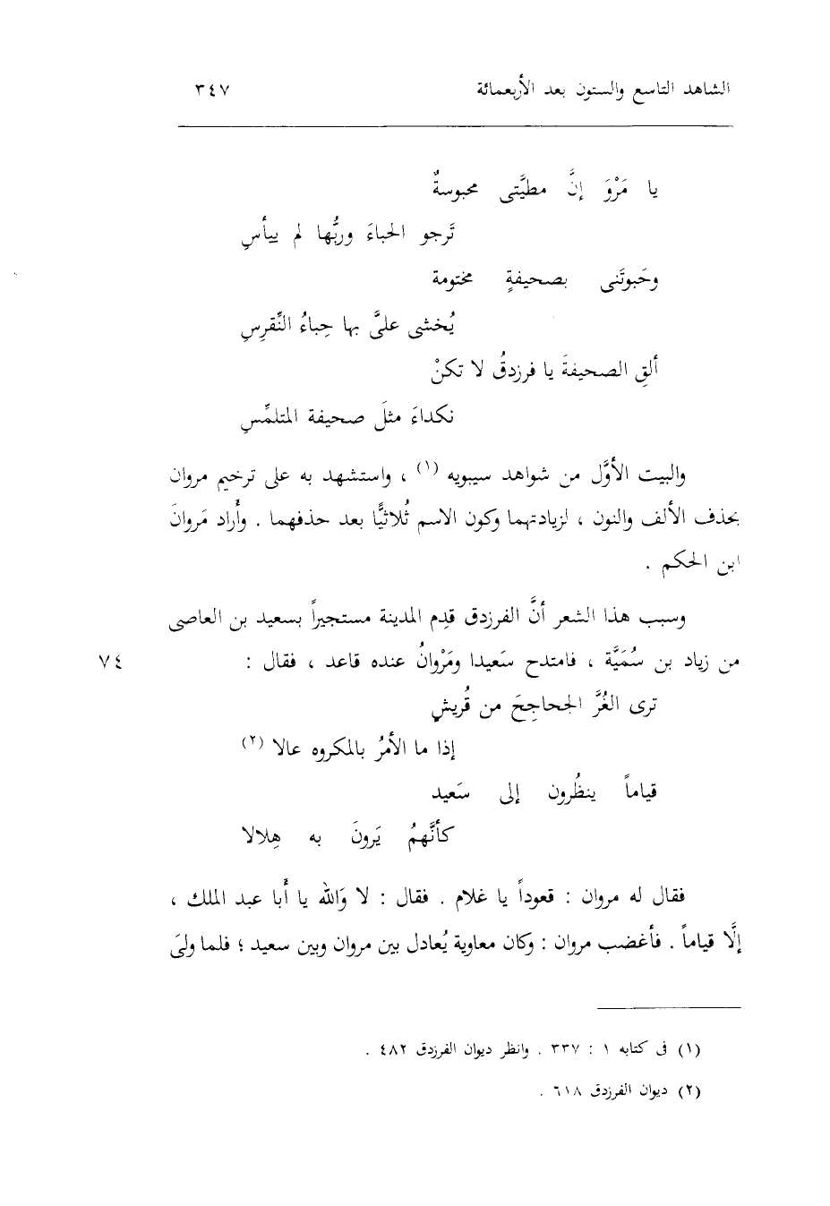 وَالْبَيْت الأول من شَوَاهِد سِيبَوَيْهٍ وَاسْتشْهدَ بِهِ على ترخيم مَرْوَان بِحَذْف الْألف وَالنُّون لزيادتهما وَكَون الِاسْم ثلاثياً بعد حذفهما. وَأَرَادَ مَرْوَان بن الحكم.