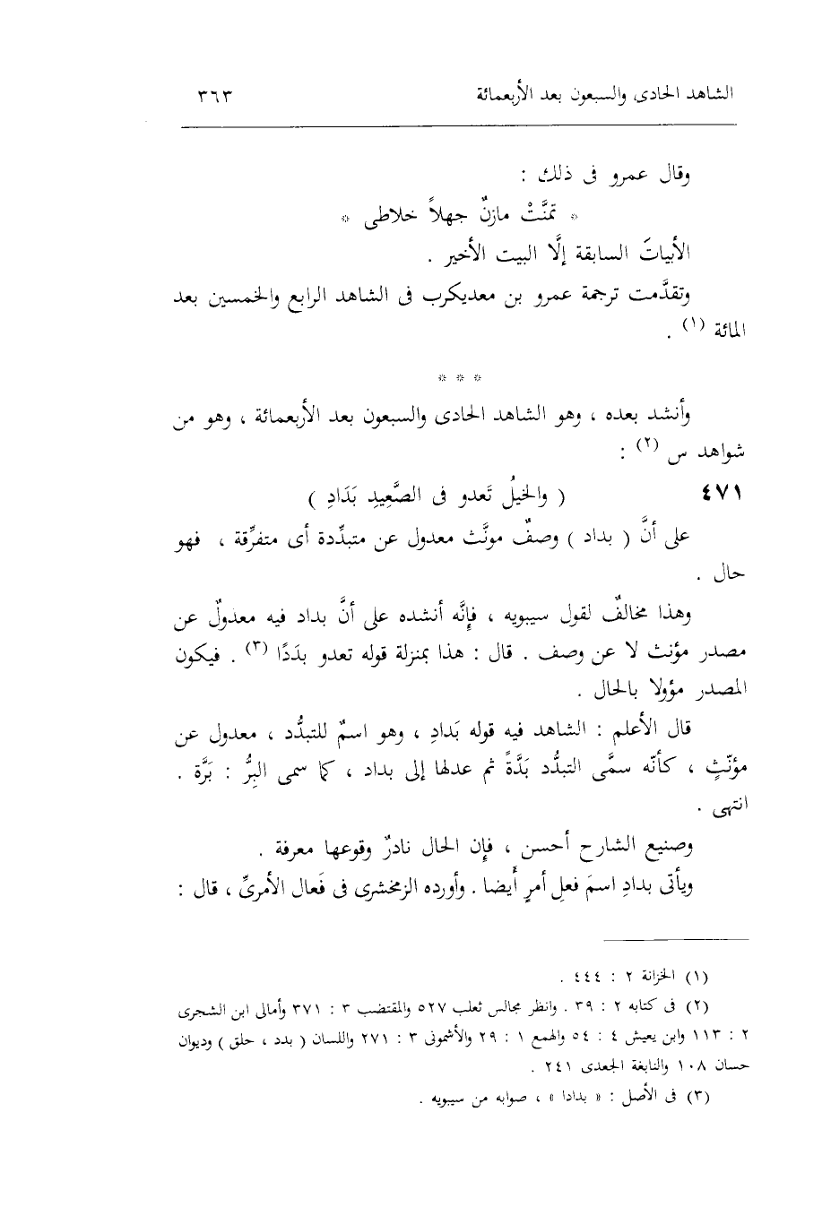 الأبيات السَّابِقَة إِلَّا الْبَيْت الْأَخير. وَتَقَدَّمت تَرْجَمَة عَمْرو بن معديكرب فِي الشَّاهِد الرَّابِع وَالْخمسين بعد الْمِائَة. وَأنْشد بعده وَهُوَ من شَوَاهِد س: وَالْخَيْل تعدو فِي الصَّعِيد بداد على أَن بداد وصفٌ مؤنث معدول عَن متبددة أَي: مُتَفَرِّقَة فَهُوَ حَال. وَهَذَا مخالفٌ لقَوْل سِيبَوَيْهٍ فَإِنَّهُ أنْشدهُ على أَن بداد فِيهِ معدولٌ عَن مصدر مؤنث لَا عَن وصف. قَالَ: هَذَا بِمَنْزِلَة قَوْله تعدوا بدداً. فَيكون الْمصدر مؤولاً بِالْحَال. قَالَ الأعلم: الشَّاهِد فِيهِ قَوْله بداد وَهُوَ اسمٌ للتبدد معدول عَن مؤنثٍ كَأَنَّهُ سمى التبدد بدةً ثمَّ عدلها إِلَى بداد كَمَا سمي الْبر: برة.