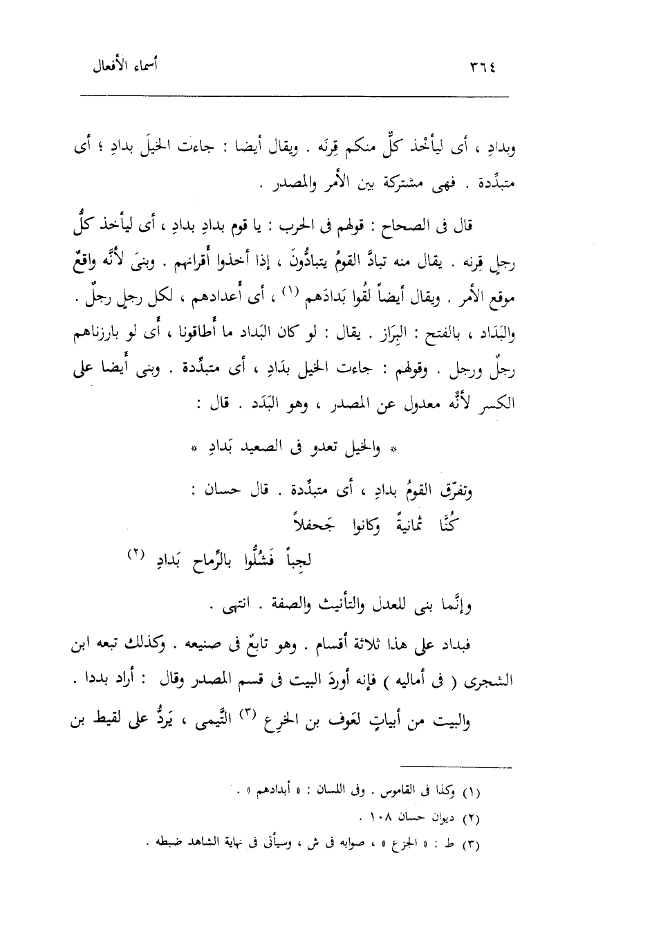 وَإِنَّمَا بني للعدل والتأنيث وَالصّفة. انْتهى. ف بداد على هَذَا ثَلَاثَة أَقسَام. وَهُوَ تَابع فِي صَنِيعه. وَكَذَلِكَ تبعه ابْن الشجري فِي أَمَالِيهِ فَإِنَّهُ أورد الْبَيْت فِي قسم الْمصدر وَقَالَ: أَرَادَ بدداً. وَالْبَيْت من أبياتٍ لعوف بن الخرع التَّيْمِيّ يرد على لَقِيط بن