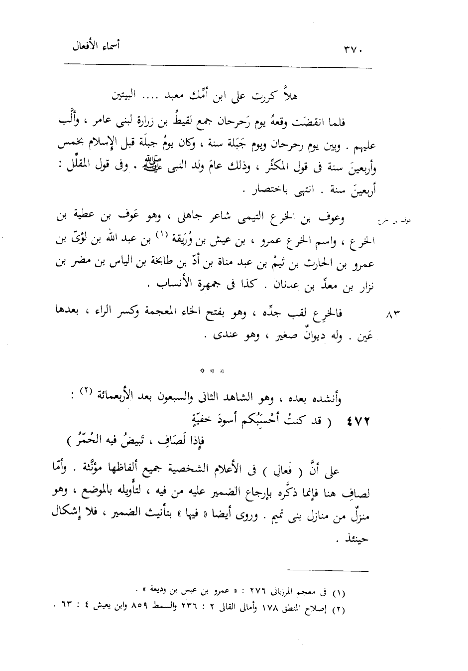 وعَوْف بن خرع التَّيْمِيّ شَاعِر جاهلي وَهُوَ عَوْف بن عَطِيَّة بن الخرع وَاسم الخرع عَمْرو بن عَيْش بن وريقة بن عبد الله بن لؤَي بن عَمْرو بن الْحَارِث ابْن تيم بن عبد مَنَاة بن أد بن طابخة بن إلْيَاس بن مُضر بن نزار بن معد بن عدنان. كَذَا فِي جمهرة الْأَنْسَاب. فالخرع لقب جده وَهُوَ بِفَتْح الْخَاء الْمُعْجَمَة وَكسر الرَّاء بعْدهَا عين. وَله ديوَان صَغِير وَهُوَ عِنْدِي. وَأنْشد بعده الشَّاهِد الثَّانِي وَالسَّبْعُونَ بعد الأربعمائة