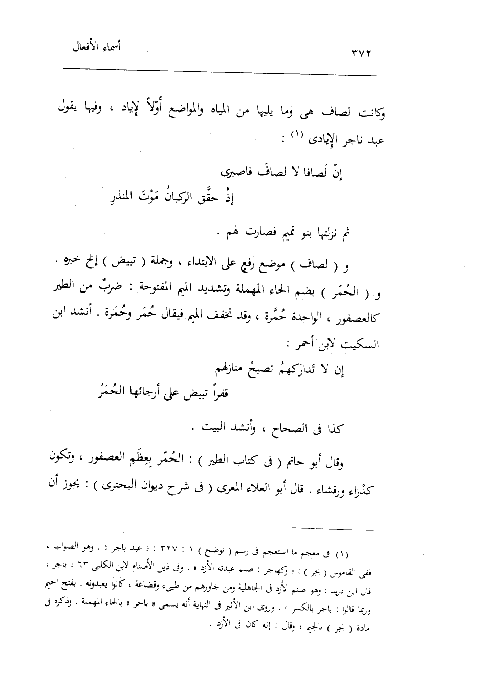 كَذَا فِي الصِّحَاح وَأنْشد الْبَيْت. وَقَالَ أَبُو حَاتِم فِي كتاب الطير: الْحمر بِعظم العصفور وَتَكون كدراء ورقشاء. قَالَ أَبُو الْعَلَاء المعري فِي شرح ديوَان البحتري: يجوز أَن
