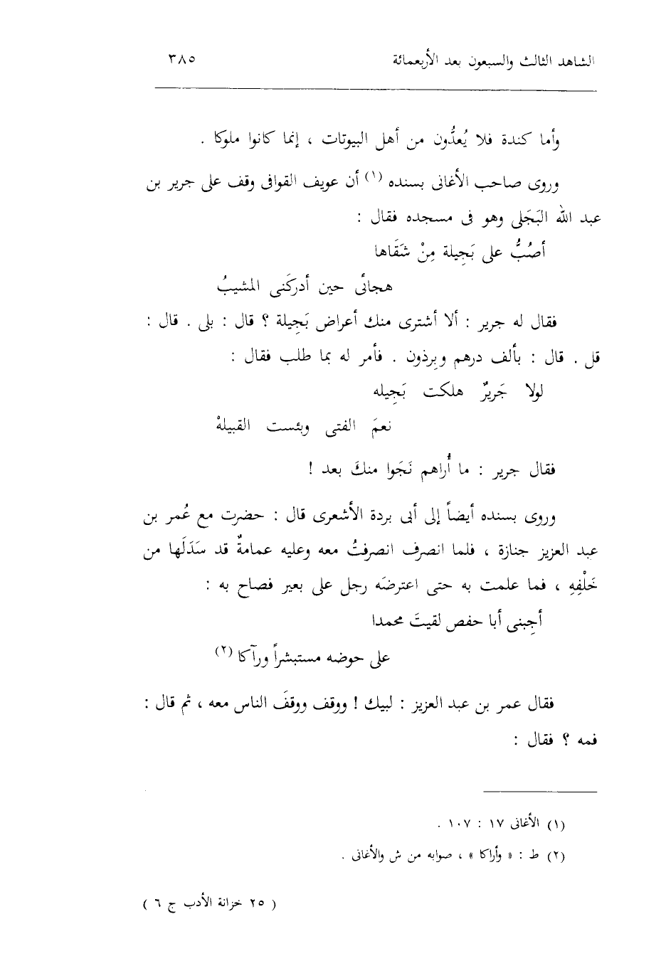 فَقَالَ لَهُ جرير: أَلا أَشْتَرِي مِنْك أَعْرَاض بجيلة قَالَ: بلَى. قَالَ: قل. قَالَ: بِأَلف دِرْهَم وبرذون.