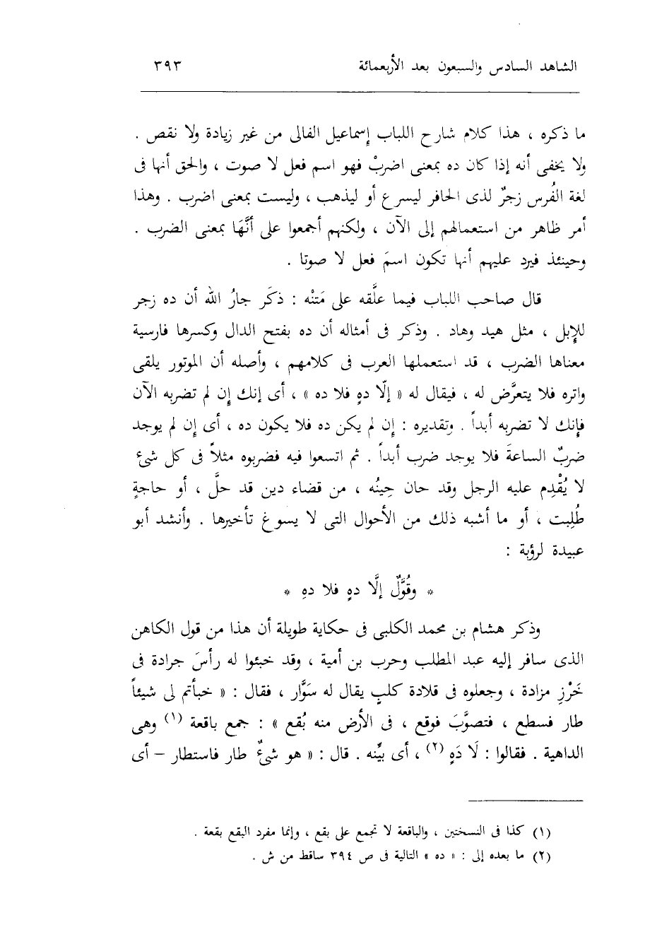 مَا ذكره هَذَا كَلَام شَارِح اللّبَاب إِسْمَاعِيل الفالي من غير زِيَادَة وَلَا نقص. وَلَا يخفى أَنه إِذا كَانَ ده بِمَعْنى اضْرِب فَهُوَ اسْم فعل لَا صَوت وَالْحق أَنَّهَا فِي لُغَة الْفرس زجرٌ لذِي الْحَافِر ليسرع أَو ليذْهب وَلَيْسَت بِمَعْنى اضْرِب. وَهَذَا أَمر ظَاهر من استعمالهم إِلَى الْآن وَلَكنهُمْ أَجمعُوا على أَنَّهَا بِمَعْنى الضَّرْب. وَحِينَئِذٍ فَيرد عَلَيْهِم أَنَّهَا تكون اسْم فعل لَا صَوتا. قَالَ صَاحب اللّبَاب فِيمَا علقه على مَتنه: ذكر جَار الله أَن ده زجر لِلْإِبِلِ مثل هيد وهاد. وَذكر فِي أَمْثَاله أَن ده بِفَتْح الدَّال وَكسرهَا فارسية مَعْنَاهَا الضَّرْب قد استعملها الْعَرَب فِي كَلَامهم وَأَصله أَن الموتور يلقِي واتره فَلَا يتَعَرَّض لَهُ فَيُقَال لَهُ: إِلَّا دهٍ فَلَا ده أَي: إِنَّك إِن لم تضربه الْآن فَإنَّك لَا تضربه أبدا.