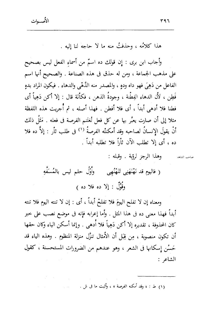 وحذفت مِنْهُ مَا لَا حَاجَة لنا إِلَيْهِ. وَأجَاب ابْن بري: إِن قَوْلك ده اسمٌ من أَسمَاء الْفِعْل لَيْسَ بِصَحِيح على مَذْهَب الْجَمَاعَة وَمن لَهُ حذق فِي هَذِه الصِّنَاعَة. وَالصَّحِيح أَنَّهَا اسْم الْفَاعِل من دهي فَهُوَ داه ودهٍ والمصدر مِنْهُ الدهي والدهاء. فَيكون المُرَاد بدهٍ فطن لِأَن الدهاء الفطنة وجودة الذِّهْن فَكَأَنَّهُ قَالَ: إِلَّا أكن دهياً أَي: فطناً فَلَا أدهى أبدا أَي: فَلَا أفطن. فَهَذَا أَصله ثمَّ أجريت هَذِه اللَّفْظَة مثلا إِلَى أَن صَارَت يعبر بهَا عَن كل فعل تغتنم الفرصة فِي فعله. مثل ذَلِك أَن يَقُول الْإِنْسَان لصَاحبه وَقد أمكنته الفرصة فِي طلب ثأر: إِلَّا ده فَلَا ده أَي: إِلَّا تطلب الْآن ثأراً فَلَا تطلبه أبدا وَهَذَا الرجز لرؤبة. وَقَبله: