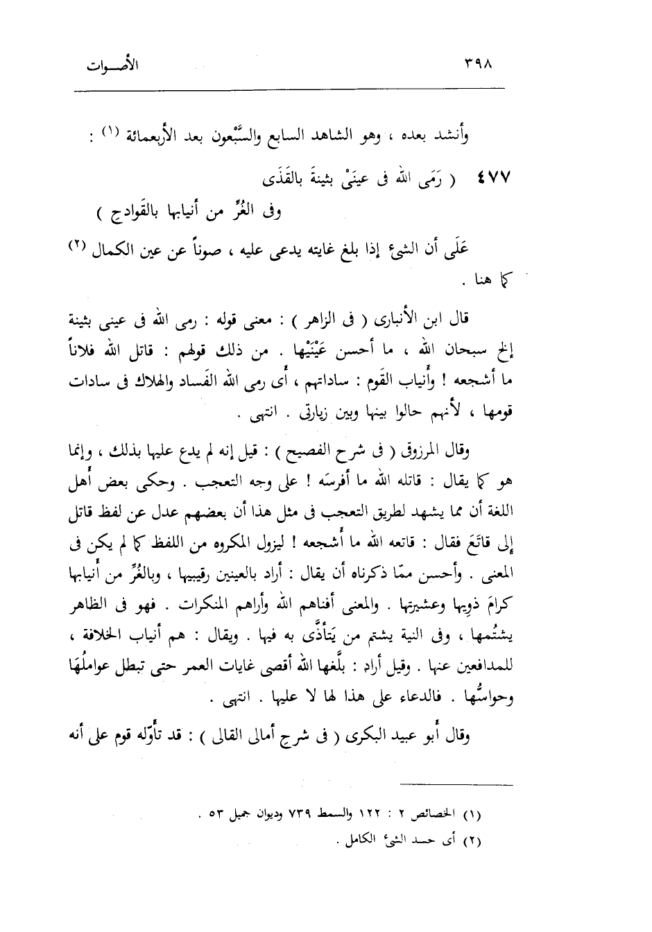 على أَن الشَّيْء إِذا بلغ غَايَته يدعى عَلَيْهِ صونا عَن عين الْكَمَال كَمَا هُنَا. قَالَ ابْن الْأَنْبَارِي فِي الزَّاهِر: معنى قَوْله: رمى الله فِي عَيْني بثينة إِلَخ سُبْحَانَ الله مَا أحسن عينيها. من ذَلِك قَوْلهم: قَاتل الله فلَانا مَا أشجعه وأنياب الْقَوْم: ساداتهم أَي: رمى الله الْفساد والهلاك فِي سَادَات قَومهَا لأَنهم حالوا بَينهَا وَبَين زيارتي. انْتهى.