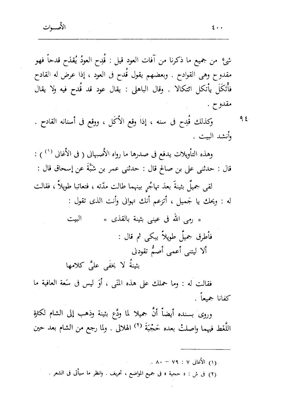 وَهَذِه التأويلات يدْفع فِي صدرها مَا رَوَاهُ الْأَصْفَهَانِي فِي الأغاني: قَالَ: حَدثنِي عَليّ بن صَالح قَالَ: حَدثنِي عمر بن شبة عَن إِسْحَاق قَالَ: لَقِي جميلٌ بثينة بعد تهاجرٍ بَينهمَا طَالَتْ مدَّته فتعاتبا طَويلا فَقَالَت لَهُ: وَيحك يَا جميل أتزعم أَنَّك تهواني وَأَنت الَّذِي تَقول: فَأَطْرَقَ جميلٌ طَويلا يبكي ثمَّ قَالَ: بل أَنا الْقَائِل: