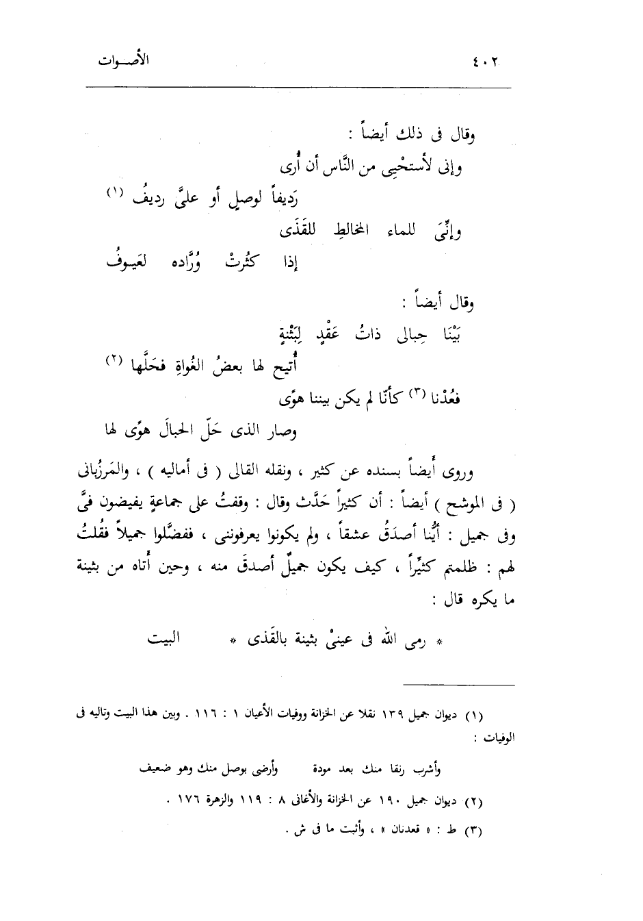 وروى أَيْضا بِسَنَدِهِ عَن كثير وَنَقله القالي فِي أَمَالِيهِ والمرزباني فِي الموشح أَيْضا: أَن كثيرا حدث وَقَالَ: وقفت على جماعةٍ يفيضون فِي وَفِي جميلٍ: أَيّنَا أصدق عشقاً وَلم يَكُونُوا يعرفونني ففضلوا جميلاً فَقُلْنَ لَهُم: ظلمتم كثيرا كَيفَ يكون جميلٌ أصدق مِنْهُ وَحين أَتَاهُ من بثينة مَا يكره قَالَ: رمى الله فِي عَيْني بثينة بالقذى الْبَيْت