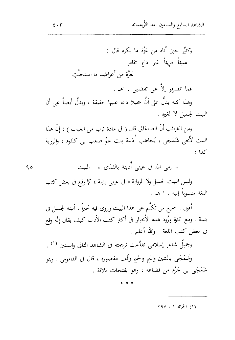 أَقُول: جَمِيع من تكلم على هَذَا الْبَيْت وروى فِيهِ خَبرا أثْبته لجميل فِي بثينة. وَمَعَ كَثْرَة وُرُود هَذِه الْأَخْبَار فِي أَكثر كتب الْأَدَب كَيفَ يُقَال أَنه وَقع فِي بعض كتب اللُّغَة. وَالله أعلم. وجميلٌ شَاعِر إسلامي تقدّمت تَرْجَمته فِي الشَّاهِد الثَّانِي وَالسِّتِّينَ. وشمجى بالشين وَالْمِيم وَالْجِيم وَألف مَقْصُورَة قَالَ فِي الْقَامُوس: وَبَنُو شمجى بن جرم من قضاعة وَهُوَ بِفَتَحَات ثَلَاثَة.