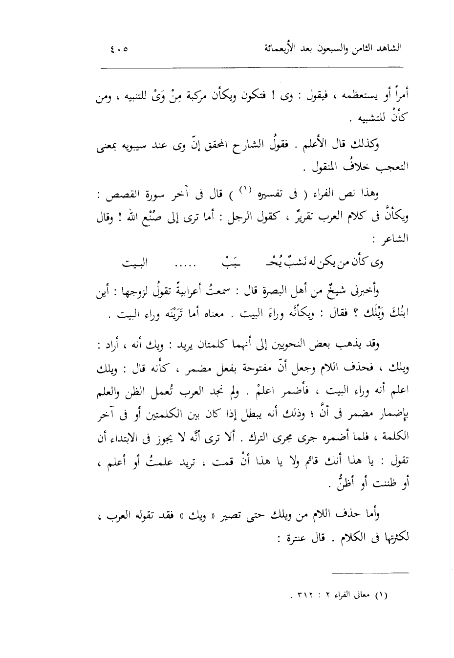 أمرا أَو يستعظمه فَيَقُول: وي فَتكون ويكأن مركبة من وي للتّنْبِيه وَمن كَأَن للتشبيه. وَكَذَلِكَ قَالَ الأعلم: فَقَوْل الشَّارِح الْمُحَقق إِن وي عِنْد سِيبَوَيْهٍ بِمَعْنى التَّعَجُّب خلاف الْمَنْقُول. وَهَذَا نَص الْفراء فِي تَفْسِيره قَالَ فِي آخر سُورَة الْقَصَص: ويكأن فِي كَلَام الْعَرَب تقريرٌ كَقَوْل الرجل: أما ترى إِلَى صنع الله.