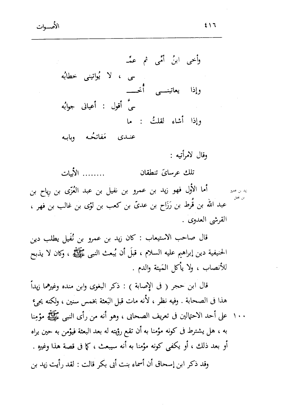 وَقَالَ لامرأتيه: تِلْكَ عرساي تنطقان ... ... ... ... . . الأبيات أما الأول فَهُوَ زيد بن عَمْرو بن نفَيْل بن عبد الْعُزَّى بن ريَاح بن عبد الله بن قرط بن رزاح بن عدي بن كَعْب بن لؤَي بن غَالب بن فهر: الْقرشِي الْعَدوي. قَالَ صَاحب الِاسْتِيعَاب: كَانَ زيد بن عَمْرو بن نفَيْل يطْلب دين الحنيفية دين إِبْرَاهِيم عَلَيْهِ السَّلَام قبل أَن يبْعَث النَّبِي صَلَّى اللَّهُ عَلَيْهِ وَسَلَّم َ وَكَانَ لَا يذبح للأنصاب وَلَا يَأْكُل الْميتَة وَالدَّم. قَالَ ابْن حجر فِي الْإِصَابَة: ذكر الْبَغَوِيّ وبن مَنْدَه وَغَيرهمَا زيدا هَذَا فِي الصَّحَابَة. وَفِيه نظر لِأَنَّهُ مَاتَ قبل الْبعْثَة بِخمْس سِنِين وَلكنه يَجِيء على أحد الِاحْتِمَالَيْنِ فِي تَعْرِيف الصَّحَابِيّ وَهُوَ أَنه من رأى النَّبِي صلى الله عَلَيْهِ)