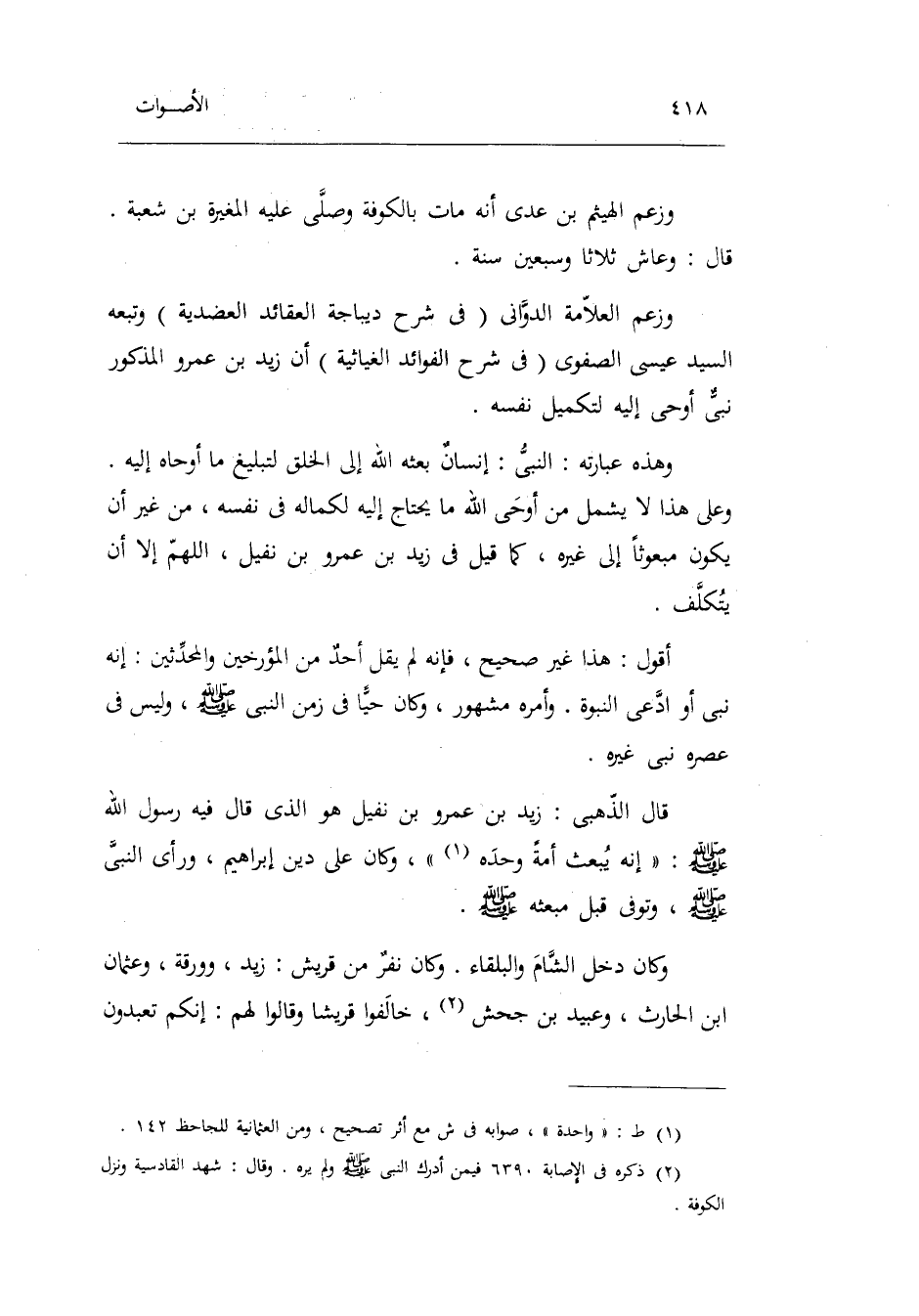 وعَلى هَذَا لَا يَشْمَل من أوحى الله مَا يحْتَاج إِلَيْهِ لكماله فِي نَفسه من غير أَن يكون مَبْعُوثًا إِلَى غَيره كَمَا قيل فِي زيد بن عَمْرو بن نفَيْل اللَّهُمَّ إِلَّا أَن يتَكَلَّف. أَقُول: هَذَا غير صَحِيح فَإِنَّهُ لم يقل أحدٌ من المؤرخين والمحدثين: إِنَّه نَبِي أَو ادّعى النُّبُوَّة. وَأمره مَشْهُور وَكَانَ حَيا فِي زمن النَّبِي صَلَّى اللَّهُ عَلَيْهِ وَسَلَّم َ وَلَيْسَ فِي عصره نَبِي غَيره. قَالَ الذَّهَبِيّ: زيد بن عَمْرو بن نفَيْل هُوَ الَّذِي قَالَ فِيهِ رَسُول الله صَلَّى اللَّهُ عَلَيْهِ وَسَلَّم َ: إِنَّه يبْعَث أمة وَحده وَكَانَ على دين إِبْرَاهِيم وَرَأى النَّبِي صَلَّى اللَّهُ عَلَيْهِ وَسَلَّم َ وَتُوفِّي قبل مبعثه صَلَّى اللَّهُ عَلَيْهِ وَسَلَّم َ. وَكَانَ دخل الشَّام والبلقاء.)