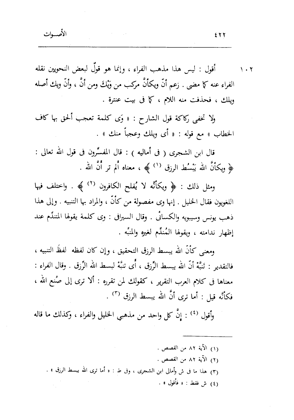 وَاخْتلف فِيهَا اللغويون فَقَالَ الْخَلِيل: إِنَّهَا وي مفصولة من كَأَن وَالْمرَاد بهَا التَّنْبِيه. وَإِلَى هَذَا ذهب يُونُس وسيبويه وَالْكسَائِيّ. وَقَالَ السيرافي: وي كلمة يَقُولهَا المتندم عِنْد إِظْهَار ندامته ويقولها المندم لغيره والمنبه. وَمعنى كَأَن الله يبسط الرزق التَّحْقِيق وَإِن كَانَ لَفظه لفظ التَّنْبِيه فالتقدير: تنبه أَن الله يبسط الرزق أَي: تنبه لبسط الله الرزق. وَقَالَ الْفراء مَعْنَاهُ فِي كَلَام الْعَرَب التَّقْرِير كَقَوْلِك لمن تقرر: أَلا ترى إِلَى صنع الله فَكَأَنَّهُ قيل: أما ترى أَن الله يبسط الرزق. وَأَقُول: إِن كل وَاحِد من مذهبي الْخَلِيل وَالْفراء وَكَذَلِكَ مَا قَالَه