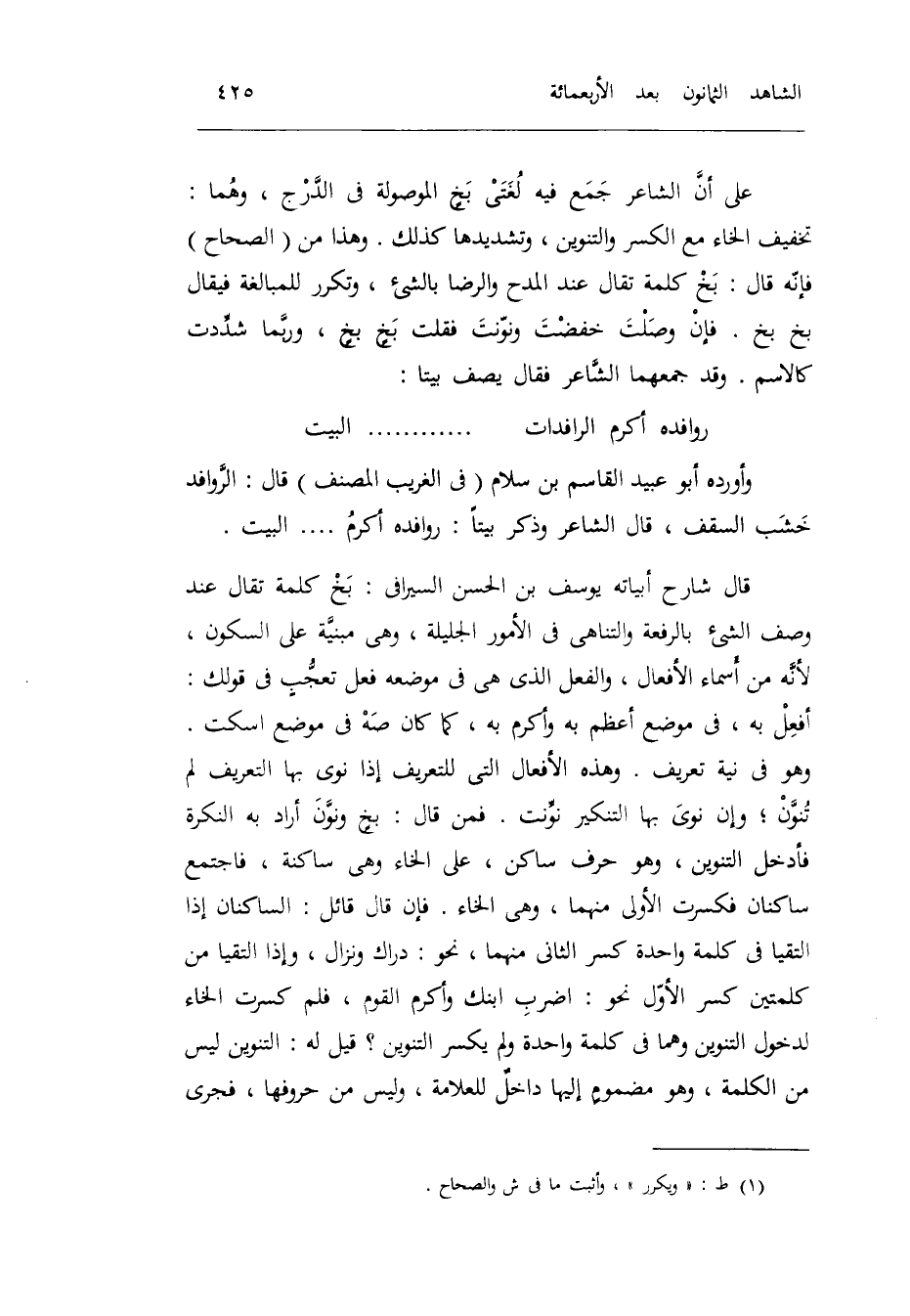 وَقد جَمعهمَا الشَّاعِر فَقَالَ يصف بَيْتا: روافده أكْرم الرافدات ... ... ... ... . . الْبَيْت وَأوردهُ أَبُو عبيد الْقَاسِم بن سَلام فِي الْغَرِيب المُصَنّف قَالَ: الروافد خشب السّقف قَالَ الشَّاعِر وَذكر بَيْتا: روافده أكْرم الرافدات ... ... ... ... . . الْبَيْت قَالَ شَارِح أبياته يُوسُف بن الْحسن السيرافي: بخ كلمة تقال عِنْد وصف الشَّيْء بالرفعة والتناهي فِي الْأُمُور الجليلة: وَهِي مَبْنِيَّة على السّكُون لِأَنَّهُ من أَسمَاء الْأَفْعَال وَالْفِعْل الَّذِي هِيَ فِي مَوْضِعه فعل تعجبٍ فِي قَوْلك: أفعل بِهِ فِي مَوضِع أعظم بِهِ وَأكْرم بِهِ كَمَا كَانَ صه فِي مَوضِع اسْكُتْ. وَهُوَ فِي نِيَّة تَعْرِيف. وَهَذِه الْأَفْعَال الَّتِي للتعريف إِذا نوي بهَا التَّعْرِيف لم تنون وَإِن نوي بهَا التنكير نونت. فَمن قَالَ: بخٍ وَنون أَرَادَ بِهِ النكرَة فَأدْخل التَّنْوِين وَهُوَ حرف سَاكن على الْخَاء وَهِي سَاكِنة فَاجْتمع ساكنان فَكسرت الأولى مِنْهُمَا وَهِي الْخَاء. فَإِن قَالَ قَائِل: الساكنان إِذا التقيا فِي كلمة وَاحِدَة كسر الثَّانِي مِنْهُمَا نَحْو: دراك ونزال وَإِذا التقيا من كَلِمَتَيْنِ كسر الأول نَحْو: اضْرِب ابْنك وَأكْرم الْقَوْم فَلَمَّا كسرت الْخَاء لدُخُول التَّنْوِين وهما فِي كلمة وَاحِدَة وَلم يكسر التَّنْوِين قيل لَهُ: التَّنْوِين لَيْسَ من الْكَلِمَة وَهُوَ مضمومٍ إِلَيْهَا داخلٌ للعلامة وَلَيْسَ من حروفها فَجرى