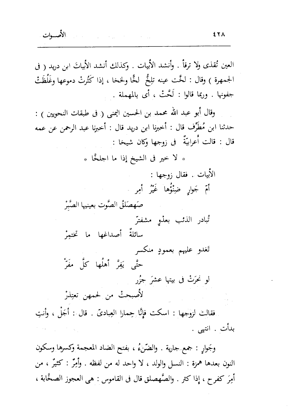 (أم جوارٍ ضنؤها غير أَمر ... صهصلق الصَّوْت بعينيها الصَّبْر)
