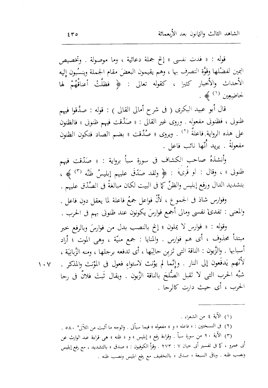 بهَا وهم يُقِيمُونَ الْبَعْض مقَام الْجُمْلَة وينسبون إِلَيْهِ الْأَحْدَاث وَالْأَخْبَار كثيرا كَقَوْلِه تَعَالَى: فظلت أَعْنَاقهم لَهَا خاضعين. قَالَ أَبُو عبيد الْبكْرِيّ فِي شرح أمالي القالي: قَوْله: صدقُوا فيهم ظنوني ف ظنوني مفعولة. وروى غير القالي: صدقت فيهم ظنوني فالظنون على هَذِه الرِّوَايَة فاعلةٌ.