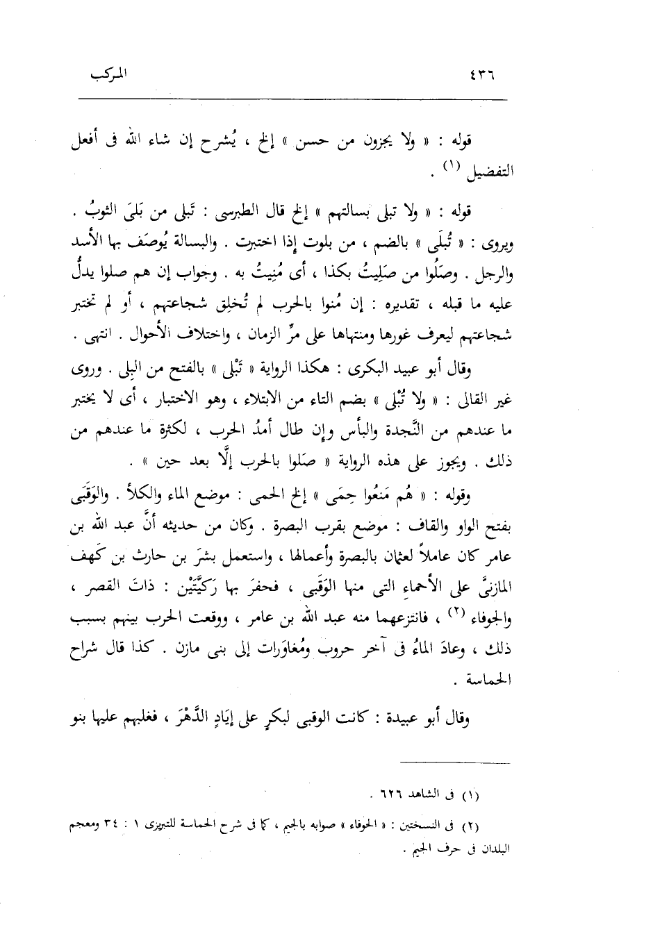 قَوْله: وَلَا يجزون من حسن إِلَخ يشْرَح إِن شَاءَ الله فِي أفعل التَّفْضِيل. قَوْله: وَلَا تبلى بسالتهم إِلَخ قَالَ الطبرسي: تبلى من بلي الثَّوْب. ويروى: تبلى بِالضَّمِّ من بلوت إِذا اختبرت. والبسالة يُوصف بهَا الْأسد وَالرجل وصلوا من صليت بِكَذَا أَي: منيت بِهِ. وَجَوَاب إِن هم صلوا يدل عَلَيْهِ مَا قبله تَقْدِيره: إِن منوا بِالْحَرْبِ لم تخلق شجاعتهم أَو لم تختبر شجاعتهم ليعرف غورها ومنتهاها على مر الزَّمَان وَاخْتِلَاف الْأَحْوَال. انْتهى. وَقَالَ أَبُو عبيد الْبكْرِيّ: هَكَذَا الرِّوَايَة تبلى بِالْفَتْح من البلى.
